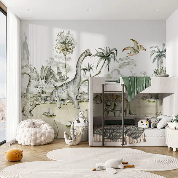 - Φωτοταπετσαρίες για παιδικό δωμάτιο με δεινόσαυρους: ρεαλιστικά τοπία, εύκολος καθαρισμός. Συνδυάστε με ζωικά μοτίβα.