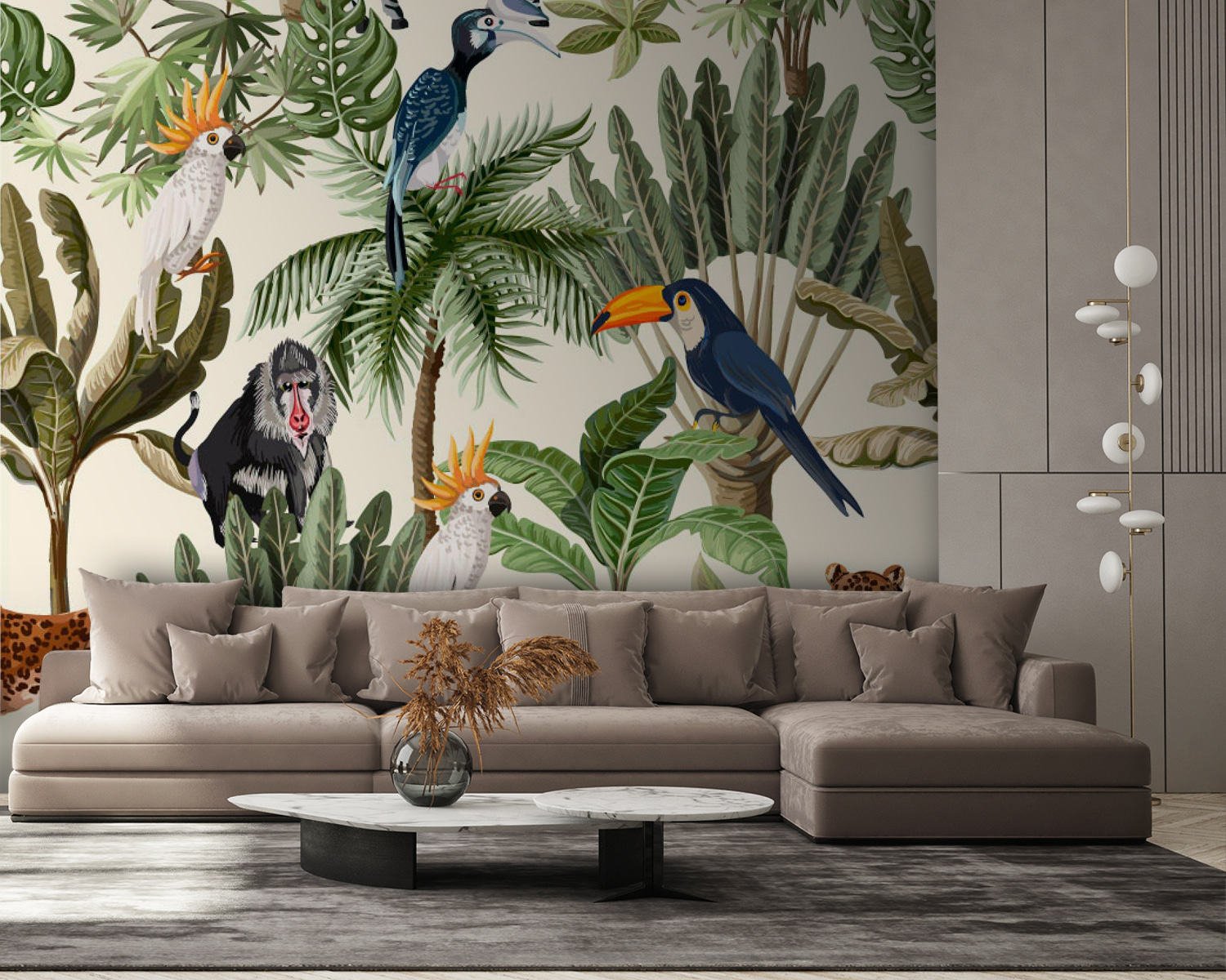 Μεταμορφώστε οποιοδήποτε δωμάτιο σε έναν τροπικό παράδεισο με αυτή τη ζωντανή τοιχογραφία τοίχου με γοητευτικά φυτά και εξωτικά πουλιά, ιδανική για όσους επιθυμούν μια πινελιά χρώματος! Φανταστείτε να μπαίνετε στο χώρο σας και να αισθάνεστε σαν να έχετε μεταφερθεί σε μια καταπράσινη ζούγκλα. Οι παιχνιδιάρικοι συνδυασμοί από παπαγάλους, λεοπαρδάλεις και άλλα ζωηρά ζωάκια προσκαλούν την αίσθηση της περιπέτειας. Είναι σαν να φέρνετε ένα μικρό κομμάτι της φύσης στους εσωτερικούς χώρους – χωρίς τα έντομα! Αυτή η τοιχογραφία είναι ιδανική για το παιδικό δωμάτιο, το σαλόνι ή οπουδήποτε αλλού χρειάζεται λίγο κέφι, και αποτελεί ένα ευχάριστο στοιχείο για συζήτηση. Είναι ακαταμάχητη!