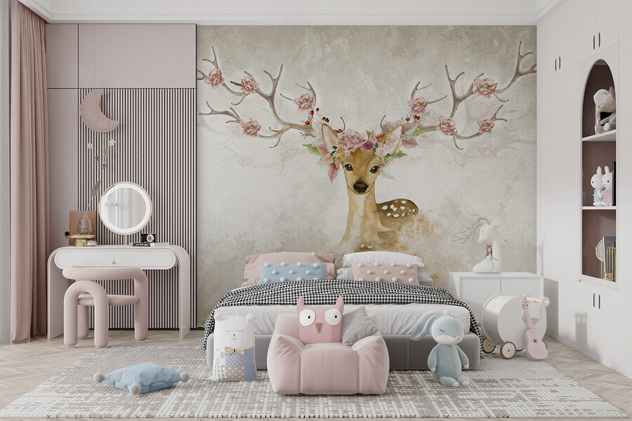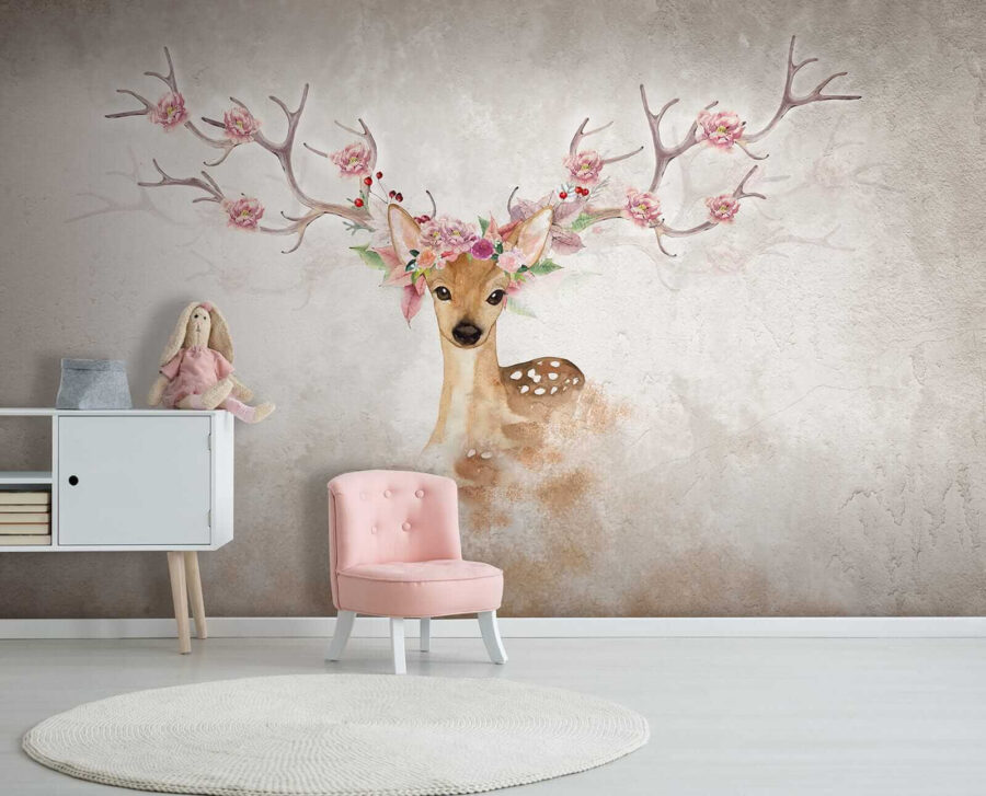 Φανταστείτε να μπαίνετε σε ένα δωμάτιο και να σας υποδέχεται αυτή η μαγευτική τοιχογραφία ακουαρέλας ενός ελαφιού με λουλούδια στο κεφάλι. Δεν είναι απλά αξιολάτρευτο; Ιδανικό για ένα παιδικό δωμάτιο ή για ένα ζεστό σημείο που ζητιανεύει για μια πινελιά ιδιοτροπίας! Έχει αυτό το υπέροχο μείγμα γήινων τόνων και ντελικάτων παστέλ που μοιάζει… μαγικό. Φανταστείτε το μικρό σας να ονειρεύεται κάτω από το άγρυπνο μάτι αυτού του ευγενικού πλάσματος. Ή, φωτίστε τον καθημερινό σας χώρο με αυτό το απαλό και γοητευτικό έργο τέχνης – εγγυημένο χαμόγελο και για τους καλεσμένους! Επιπλέον, αυτά τα λουλούδια στα κέρατα είναι πολύ όμορφα, δεν νομίζετε; Είναι σαν ένα παραμύθι που ζωντανεύει στον τοίχο σας. Αναπνεύστε τη δημιουργικότητα και αφήστε αυτές τις ονειρικές δονήσεις να κυλήσουν…