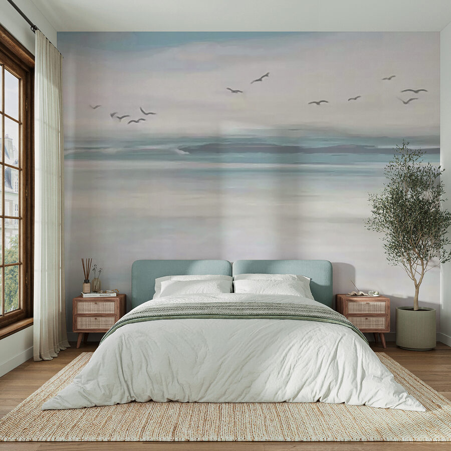 Φανταστείτε το χώρο σας να μεταμορφώνεται από αυτή την ονειρική τοιχογραφία – σαν μια απαλή υδατογραφία που ζωντανεύει! Φανταστείτε “Πουλιά που πετούν πάνω από ένα υδάτινο σώμα”, γεμίζοντας το δωμάτιό σας με γαλήνη. Είναι σαν να έχετε ένα παραθαλάσσιο καταφύγιο στο σπίτι σας, χωρίς την άμμο στα παπούτσια σας… ή τους γλάρους να κλέβουν τα σνακ σας!