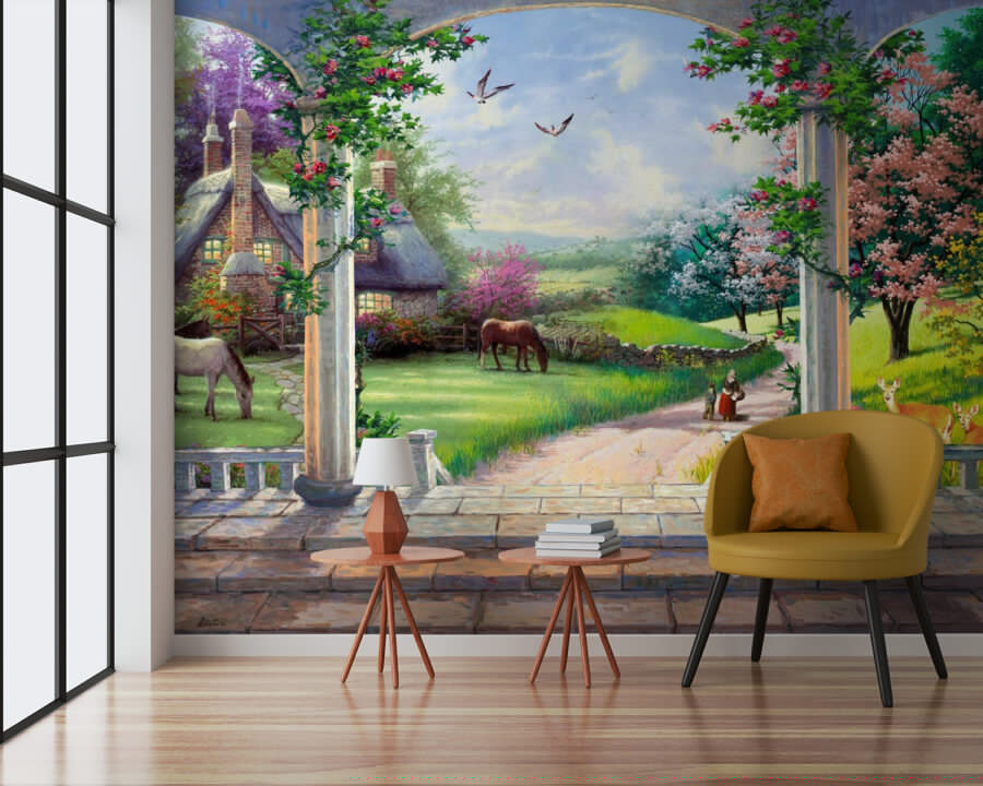 Μεταμορφώστε οποιοδήποτε δωμάτιο σε ένα γαλήνιο καταφύγιο με αυτή τη μαγευτική ταπετσαρία τοίχου! Φανταστείτε ένα ονειρικό τοπίο όπου τα άλογα βόσκουν νωχελικά και ένα γοητευτικό εξοχικό σπίτι ξεπροβάλλει ανάμεσα σε ζωντανά λουλούδια. Είναι σαν να μπαίνετε σε ένα παραμύθι, χωρίς να χρειάζεστε μαγική πύλη! Φανταστείτε να πίνετε τον πρωινό σας καφέ ενώ τα πουλιά σας τραγουδούν και τα ελάφια κάνουν την εμφάνισή τους έξω. Αυτή η ταπετσαρία φέρνει μια πινελιά φύσης στο σπίτι σας, κάνοντας την καθημερινή ζωή να φαίνεται λίγο πιο φανταστική. Ιδανική για μια ζεστή ατμόσφαιρα ή για να ξεκινήσετε συζητήσεις με φίλους. Ποιος χρειάζεται διακοπές όταν μπορεί να ζει σε ένα έργο τέχνης;