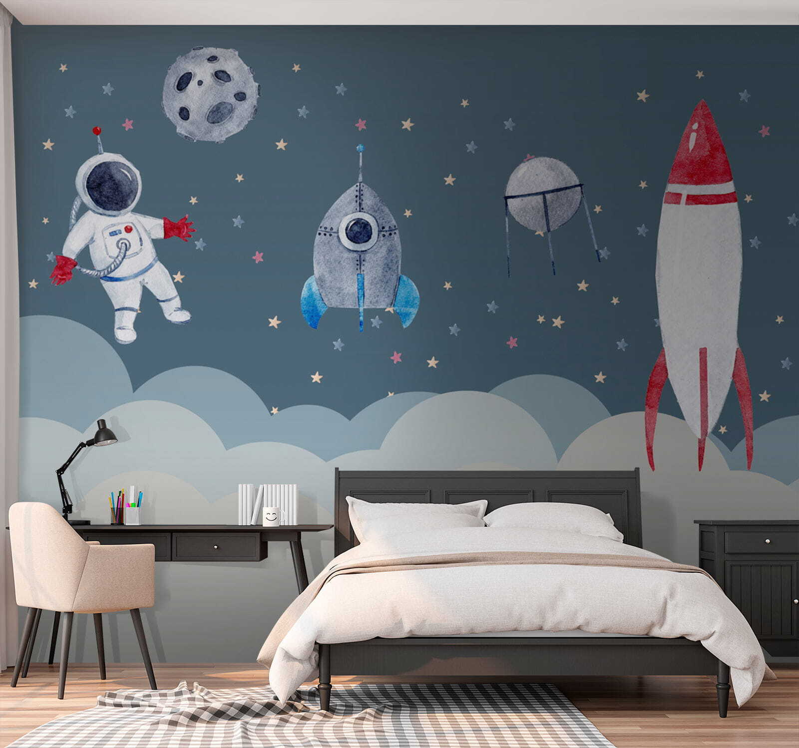 Φανταστείτε αυτό: ένα ζεστό βράδυ, τα φώτα χαμηλά και το μικρό σας παιδί να κοιτάζει αυτή την ιδιόρρυθμη τοιχογραφία αστροναύτη με ακουαρέλα. Είναι σαν ένα παραμύθι από ένα ονειρικό παραμύθι – ζωηρά αστροναυτάκια που αιωρούνται ανάμεσα στα αστέρια, κάνοντας την ώρα του ύπνου μαγική… και ίσως εμπνέοντας μελλοντικές διαστημικές περιπέτειες! Αυτή η τοιχογραφία δεν είναι απλώς τέχνη, είναι ένα εισιτήριο για έναν άλλο κόσμο. Ιδανική για κάθε παιδικό δωμάτιο, φέρνει αυτή την παιχνιδιάρικη αλλά και γαλήνια ατμόσφαιρα. Είναι γεμάτη γοητεία, με τις απαλές αποχρώσεις και τους χαρούμενους χαρακτήρες της, μετατρέποντας κάθε τοίχο σε καμβά φαντασίας. Θα σας είναι αδύνατο να μην χαμογελάτε κάθε φορά που το βλέπετε!