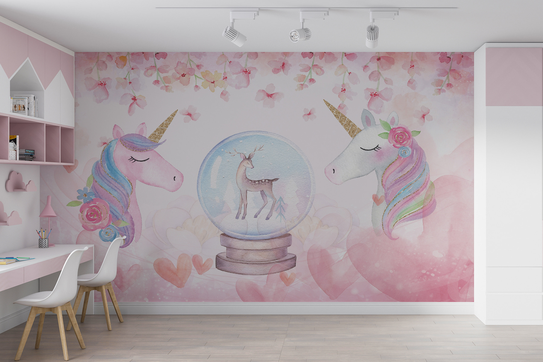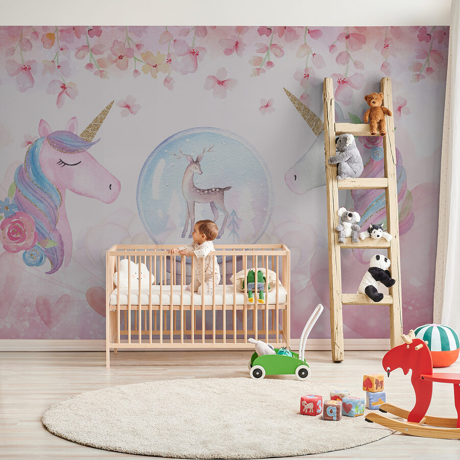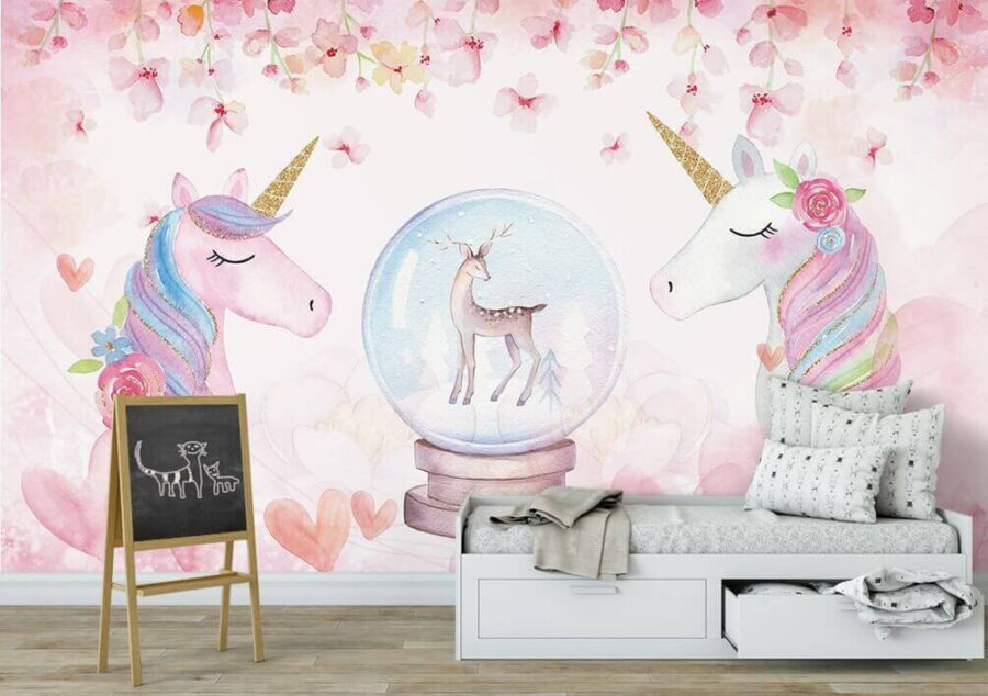 Με τρυφερούς μονόκερους ανάμεσα σε απαλές ροζ λουλουδένιες αποχρώσεις και ένα εκπληκτικό ελάφι μέσα σε μια σφαίρα χιονιού, αυτή η τοιχογραφία μοιάζει σαν να βγήκε κατευθείαν από παραμύθι. Οι απαλές αποχρώσεις ακουαρέλας ηρεμούν, ενώ οι παιχνιδιάρικες λεπτομέρειες εμπνέουν φαντασία και ιδιοτροπία.