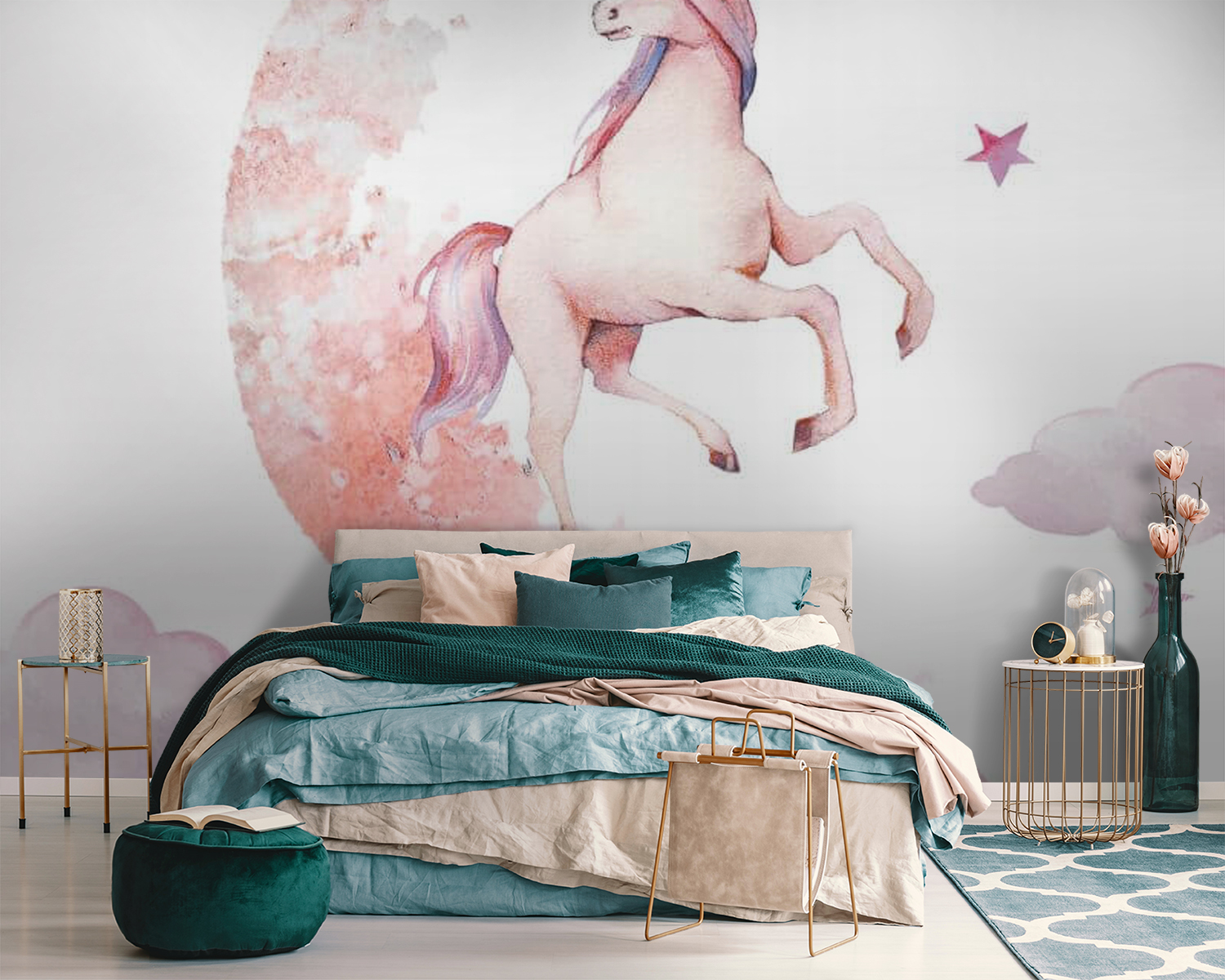 Μεταμορφώστε οποιονδήποτε χώρο με αυτή την παράξενη τοιχογραφία τοίχου με έναν μονόκερο που πηδάει κομψά πάνω από το φεγγάρι. Ιδανική για παιδικά δωμάτια ή για όσους έχουν αδυναμία στη μαγεία, προσθέτει μια δόση θαύματος στους τοίχους. Φανταστείτε άνετα βράδια που περνάτε διαβάζοντας παραμύθια, με την ευγενική παρουσία του μονόκερου να εμπνέει όνειρα από μαγεμένες χώρες και απαλά σύννεφα. Τα παιχνιδιάρικα ροζ χρώματα και οι ονειρικές νυχτερινές δονήσεις είναι βέβαιο ότι θα προκαλέσουν χαρά. Ποιος δεν θα ήθελε λίγη μαγεία στο σπίτι του; Είναι σαν να έχετε ένα κομμάτι από ένα παραμύθι ακριβώς εκεί, που περιμένει να εμπνεύσει την περιπέτεια!