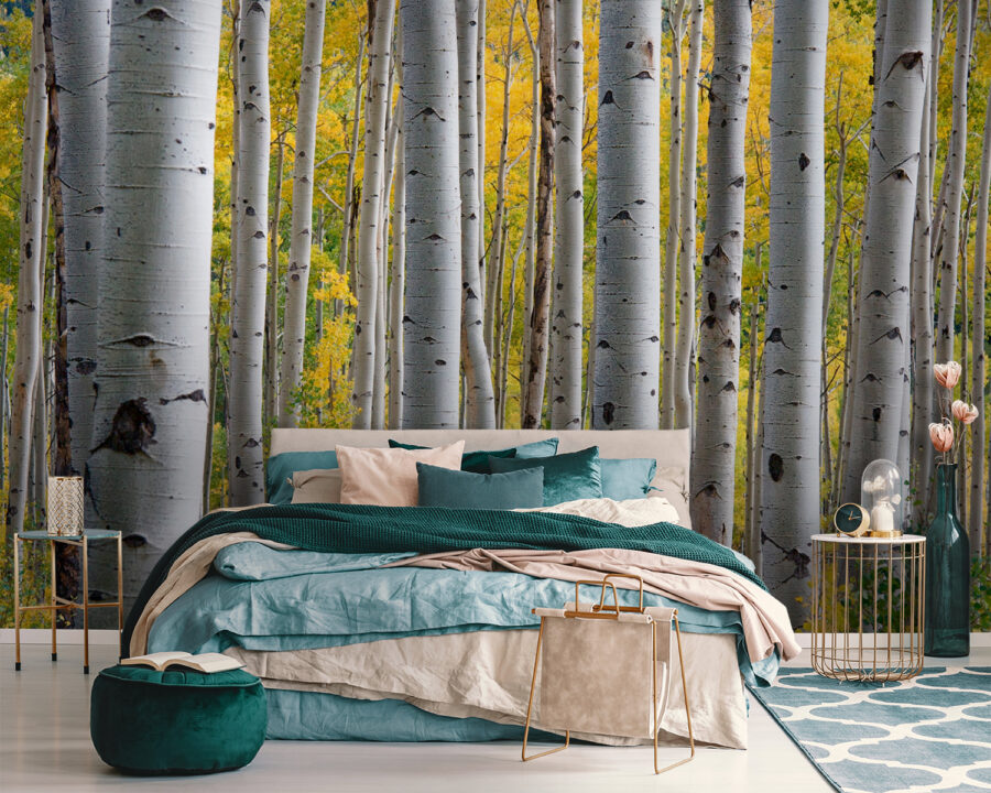 Μεταμορφώνετε έναν χώρο; Αυτή η τοιχογραφία με ένα σύμπλεγμα λευκών δέντρων με τα υπέροχα κίτρινα φύλλα τους είναι σαν να έχετε ένα κομμάτι της φύσης στον τοίχο σας. Φανταστείτε να μπαίνετε σε ένα δωμάτιο και να αισθάνεστε αμέσως αυτή τη γαλήνια ατμόσφαιρα – σαν μια ειρηνική βόλτα στο δάσος, χωρίς να βγείτε ποτέ από το σπίτι. Τα ψηλά, κομψά δέντρα μοιάζουν να παρακολουθούν, δημιουργώντας ένα απαλό σκηνικό που φέρνει ζεστασιά και ένα ποπ χρώμα. Ιδανικό για αυτές τις φιλόξενες γωνιές ή ακόμα και για τον μονότονο χώρο του γραφείου που χρειάζεται λίγη ζωή. Θα σας κάνει να θέλετε να βάλετε ένα φλιτζάνι τσάι, να πάρετε ένα καλό βιβλίο και απλά να απολαύσετε τη θέα. Ποιος ήξερε ότι οι τοίχοι θα μπορούσαν να έχουν μια τέτοια ζεστή σπίθα;