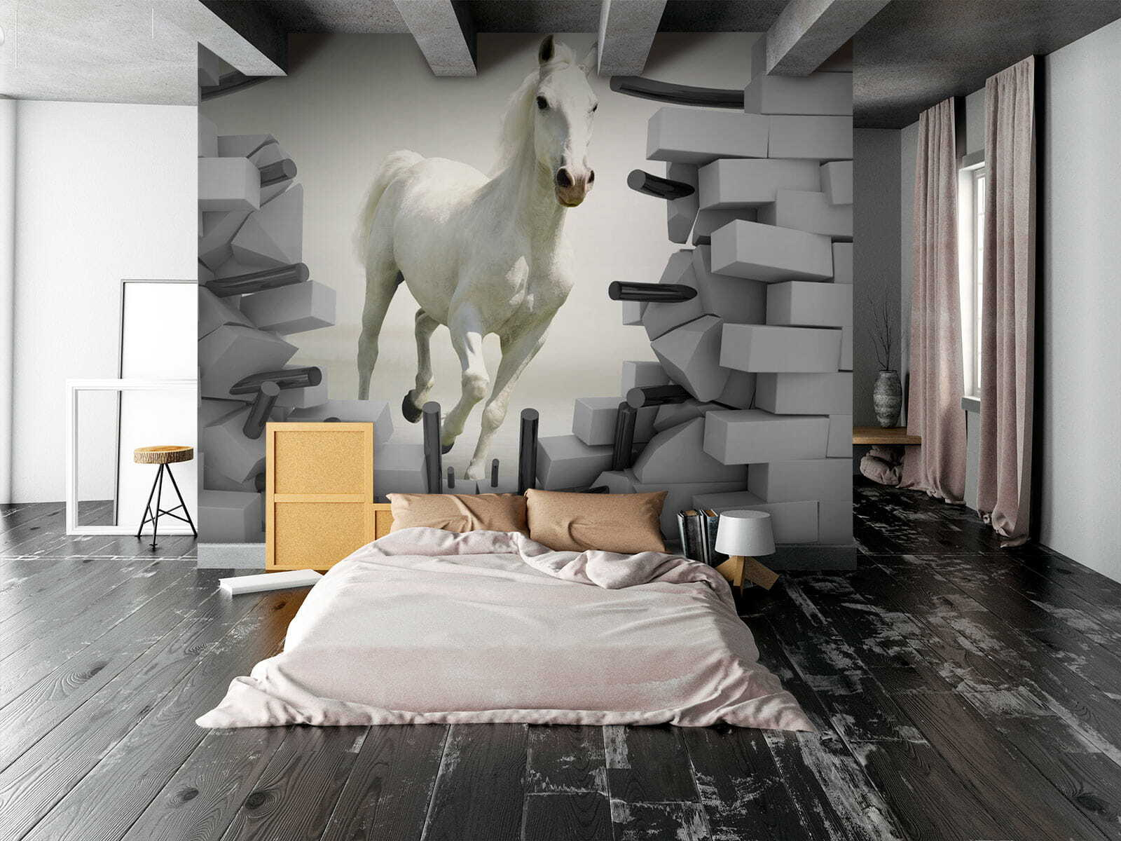 Φανταστείτε να αισθάνεστε σαν ένας λευκός επιβήτορας να καλπάζει κυριολεκτικά μέσα στο δωμάτιό σας – ακριβώς μέσα από τον τοίχο! Αυτό θα έχετε με αυτή την εκπληκτική τοιχογραφία τοίχου. Έχει αυτό το απίστευτο τρισδιάστατο εφέ που το κάνει να μοιάζει σαν το άλογο να είναι έτοιμο να πηδήξει από το έργο τέχνης και να μπει κατευθείαν στο χώρο σας. Τα παιδιά θα μείνουν με δέος, νομίζοντας ότι είναι μέρος κάποιας μαγικής περιπέτειας. Και για τους ενήλικες – είναι σίγουρα έναυσμα για συζήτηση! Είτε πρόκειται για ένα παιδικό δωμάτιο, είτε για ένα funky καθιστικό, είτε ακόμη και για έναν δημιουργικό χώρο γραφείου, αυτή η τοιχογραφία φέρνει μια έκρηξη ενέργειας και μια πινελιά ιδιοτροπίας. Είναι μαγευτική, τολμηρή και ακριβώς η σωστή ποσότητα απροσδόκητου – απλά δεν μπορείτε να την κοιτάξετε χωρίς να χαμογελάσετε!