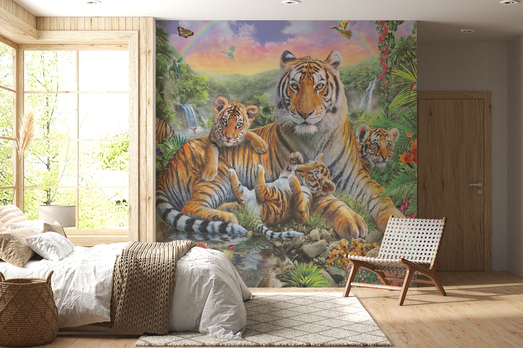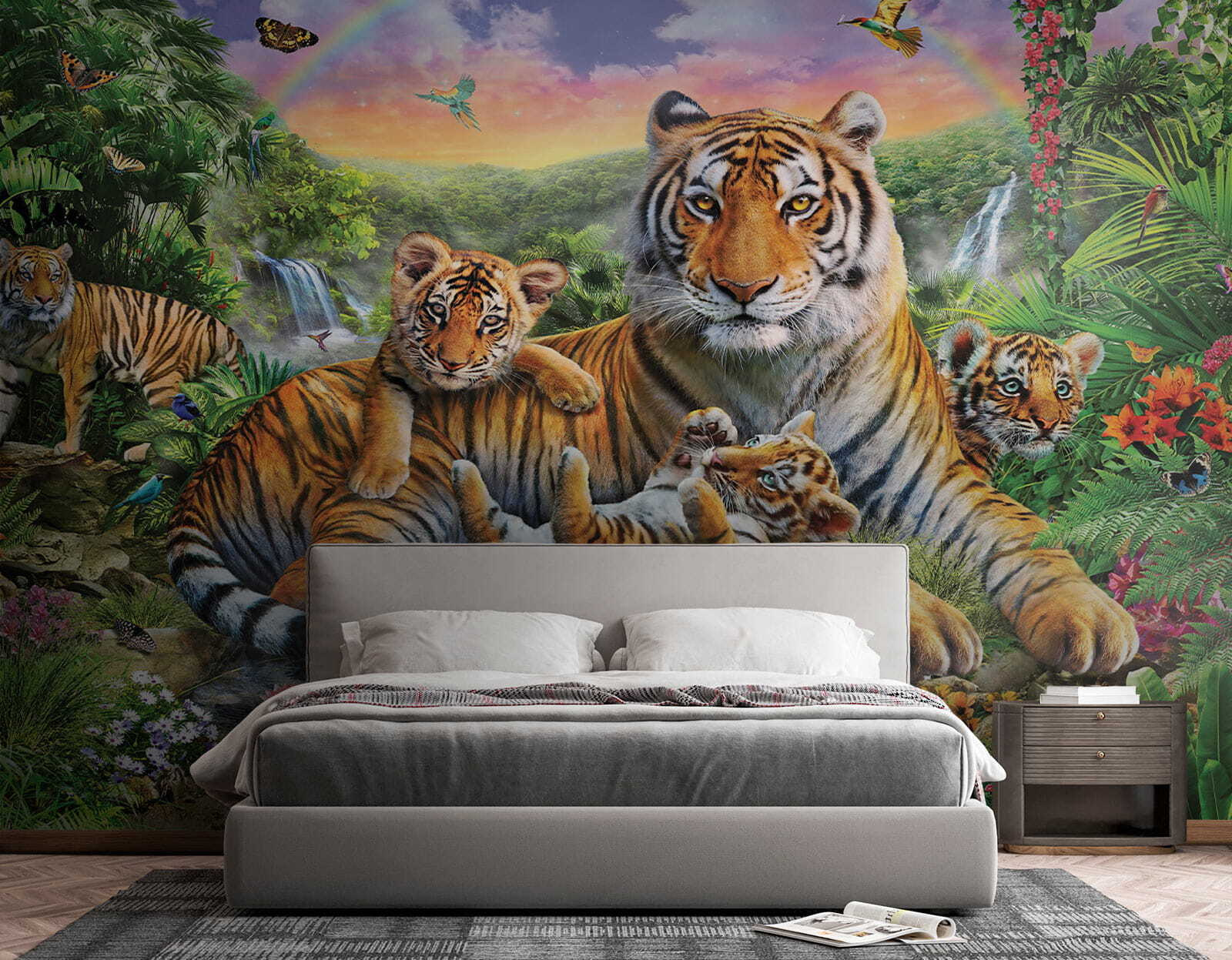 Φανταστείτε να μπαίνετε σε ένα δωμάτιο και να μεταφέρεστε αμέσως στην καρδιά μιας ζωντανής, καταπράσινης ζούγκλας – αυτό ακριβώς κάνει αυτή η “Τοιχογραφία Τίγρης που στέκεται σε μια ζούγκλα”! Με τις τίγρεις να αράζουν σαν να βρίσκονται σε τροπικές διακοπές και τα μικρά να παίζουν παιχνιδιάρικα, είναι σαν μια άγρια στιγμή του National Geographic που αποτυπώνεται στον τοίχο σας. Το πλούσιο πράσινο φύλλωμα, οι πεταλούδες που φτερουγίζουν και οι υπονοούμενα ενός ουράνιου τόξου στο φόντο δημιουργούν μια ιδιόρρυθμη σκηνή γεμάτη με τα θαύματα της φύσης. Είναι ιδανικό για να δώσετε μια μικρή περιπέτεια σε ένα παιδικό δωμάτιο ή να προσθέσετε μια πινελιά άγριας φύσης σε οποιονδήποτε χώρο χρειάζεται λίγη λάμψη. Φανταστείτε το: αράζετε στον καναπέ, ατενίζετε αυτή την τοιχογραφία και σχεδόν ακούτε τις μακρινές φωνές των ζώων της ζούγκλας… Καθαρή μαγεία! Είτε για τους μικρούς είτε για τους νεότερους, είναι ένα κομμάτι της άγριας φύσης που σίγουρα θα εξάψει τη φαντασία.