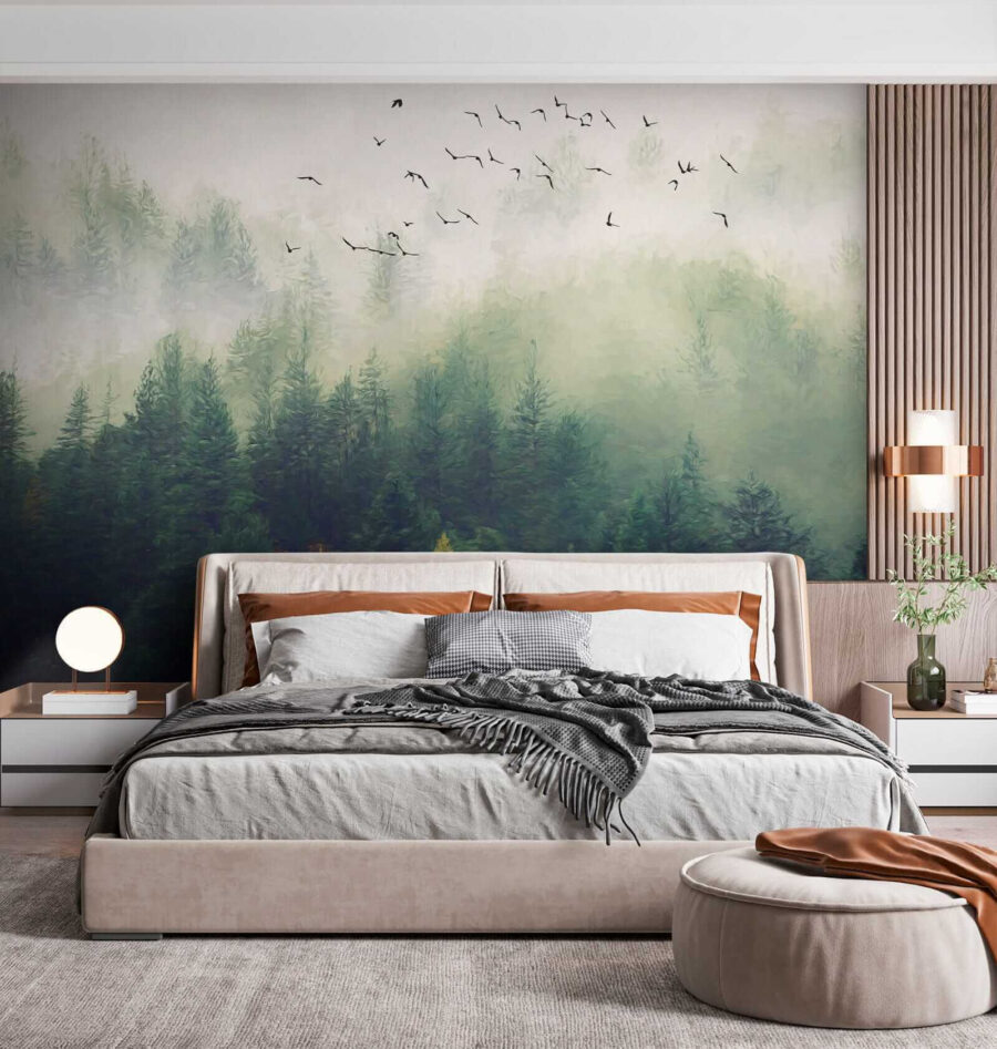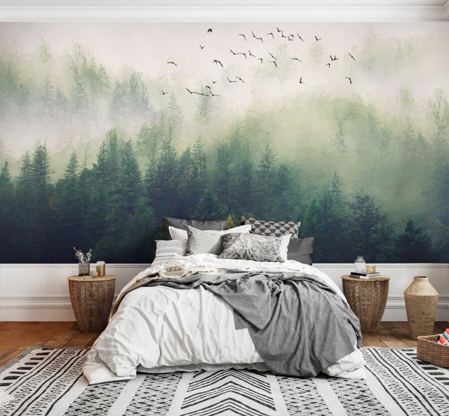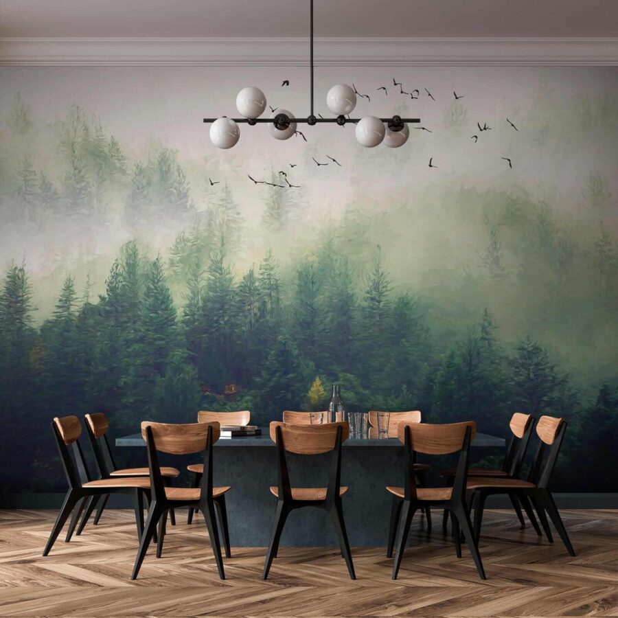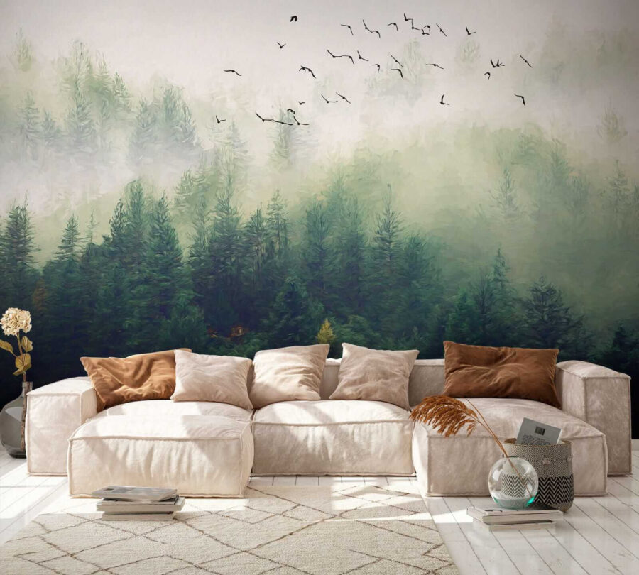 Μεταμορφώστε τον χώρο σας με αυτή την εκπληκτική τοιχογραφία που απεικονίζει πουλιά να πετούν πάνω από ένα ομιχλώδες δάσος. Φανταστείτε να μπαίνετε σε ένα γαλήνιο καταφύγιο μέσα στο σαλόνι σας! Τα απαλά πράσινα χρώματα και η απαλή ομίχλη σας τυλίγουν σαν μια ζεστή κουβέρτα, ενώ τα πουλιά φαίνεται να σας προσκαλούν να συμμετάσχετε στο ταξίδι τους. Είναι σαν η φύση να αποφάσισε να διακοσμήσει μόνη της το σπίτι σας!