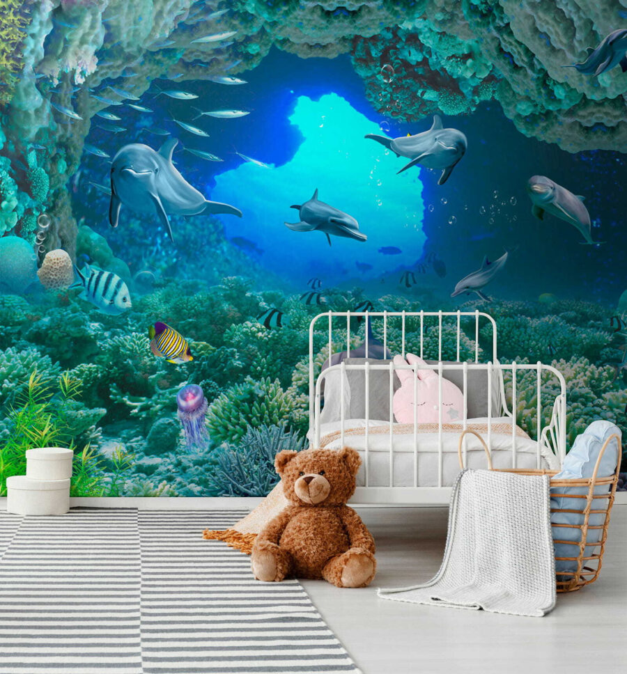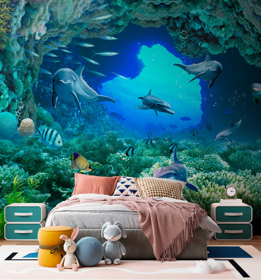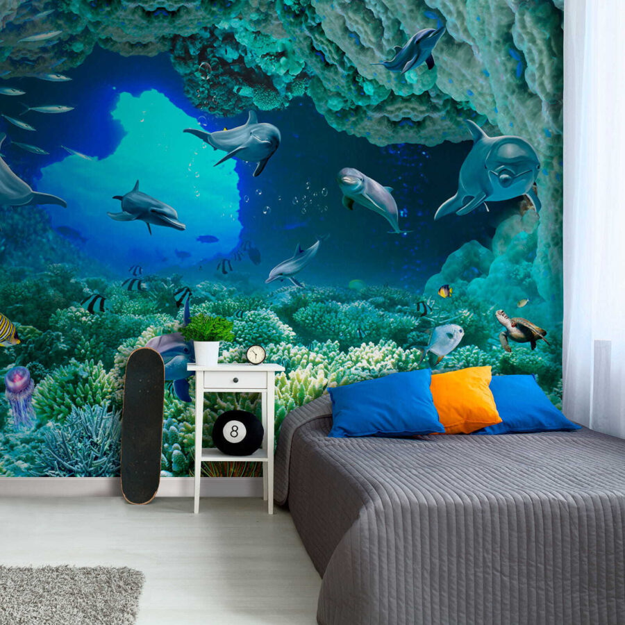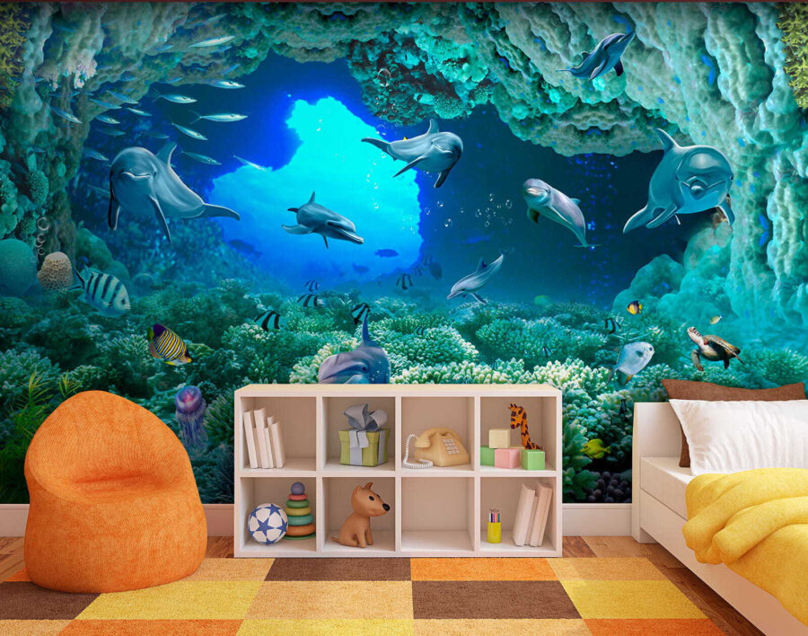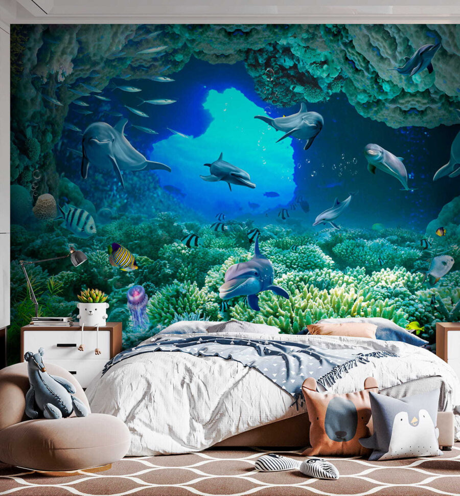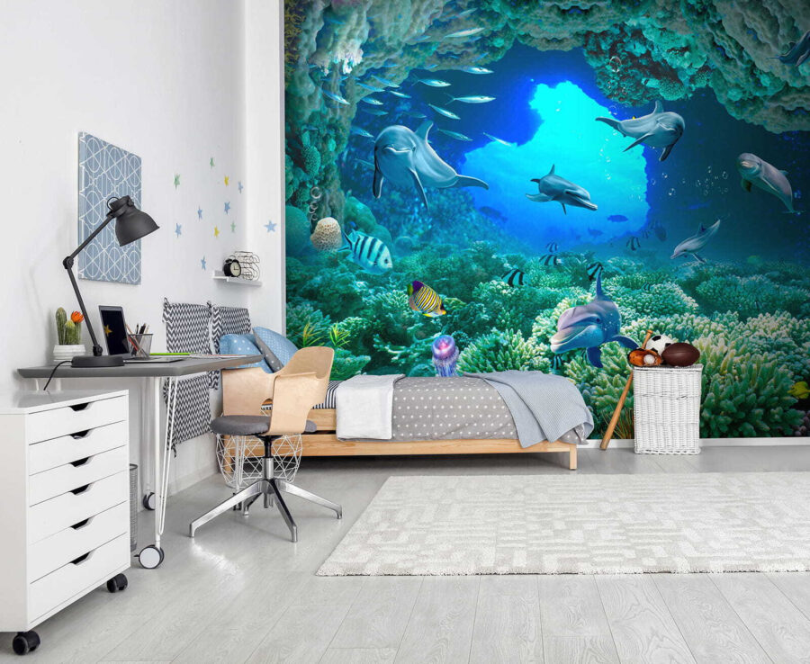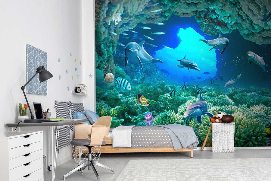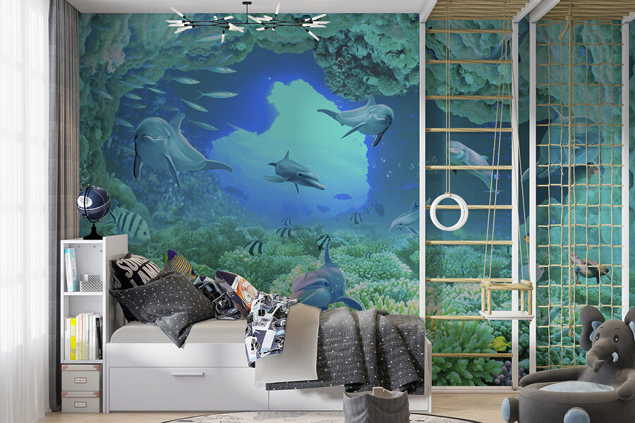 Βυθιστείτε κατευθείαν στη μαγεία του απέραντου γαλάζιου με αυτή την εκπληκτική τοιχογραφία τοίχου – “Δελφίνι κολυμπάει στο νερό”! Φανταστείτε να ξυπνάτε σε αυτόν τον ζωντανό υποβρύχιο κόσμο ακριβώς στο σαλόνι ή την κρεβατοκάμαρά σας. Τα δελφίνια φαίνονται τόσο χαρούμενα και παιχνιδιάρικα, σχεδόν σαν να σας προσκαλούν να τους ακολουθήσετε! Τα ζωντανά χρώματα και οι περίπλοκες λεπτομέρειες των κοραλλιών και των ψαριών σας κάνουν να αισθάνεστε σαν να κάνετε ψαροντούφεκο σε τροπικά νερά… χωρίς να βγείτε από το σπίτι σας. Σοβαρά, είναι ένα εισιτήριο χωρίς επιστροφή για την παραθαλάσσια ατμόσφαιρα και ποιος δεν χρειάζεται λίγο περισσότερο από αυτό;! Τα παιδιά και οι μεγάλοι θα λατρέψουν την ήρεμη αλλά και περιπετειώδη ενέργεια που φέρνει αυτή η τοιχογραφία – είναι σαν να έχετε ένα ενυδρείο αλλά χωρίς τη συντήρηση. Ιδανικό για κάθε δωμάτιο που χρειάζεται μια πινελιά ζωής και μια δόση ιδιοτροπίας – τοποθετήστε το και ετοιμαστείτε να εντυπωσιάζεστε κάθε μέρα!