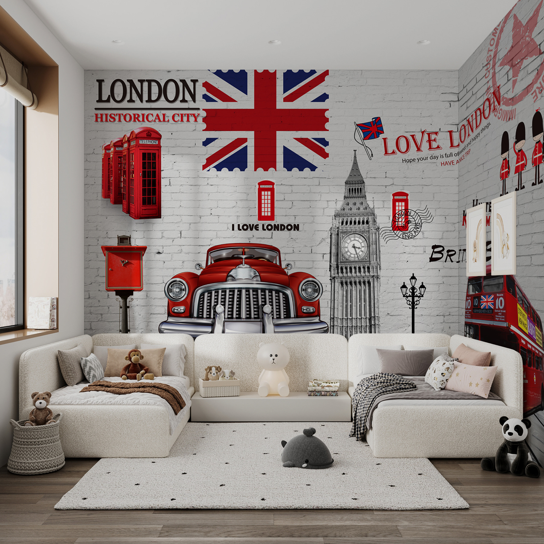 Η γοητεία του Λονδίνου στο σαλόνι σας! Αυτή η τοιχογραφία “Red Double Decker Bus” είναι σαν μια ζεστή αγκαλιά από την ίδια την πόλη. Φανταστείτε να ξυπνάτε με το εμβληματικό Big Ben, αυτούς τους ιδιόρρυθμους κόκκινους τηλεφωνικούς θαλάμους και αυτό το vintage λεωφορείο να σας περιμένει για να σας ταξιδέψει σε μια περιπέτεια. Είναι ιδανικό για όποιον αγαπάει ένα ποπ χρώμα και μια δόση από την ατμόσφαιρα της πόλης.