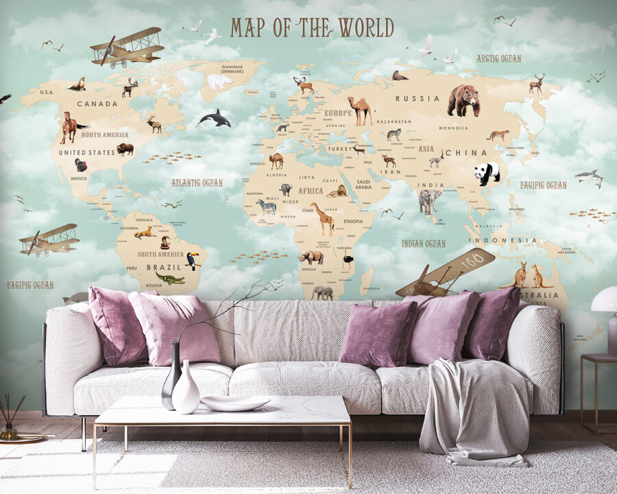 Οι απαλές γήινες αποχρώσεις και οι γοητευτικές απεικονίσεις ζώων το καθιστούν όχι μόνο για τους νέους, αλλά και ένα ευχάριστο αντικείμενο συζήτησης για όλους. Φανταστείτε το εξής: μπαίνετε μέσα και το βλέμμα σας προσγειώνεται στην Κίνα με τα πάντα της, στους μεγαλοπρεπείς αετούς που αιωρούνται πάνω από τη Βόρεια Αμερική και, α, να και η Αυστραλία με τα παιχνιδιάρικα καγκουρό της. Είναι εκπαιδευτικό, σίγουρα, αλλά και ένα ιδιόρρυθμο σκηνικό που πυροδοτεί ιστορίες και όνειρα.