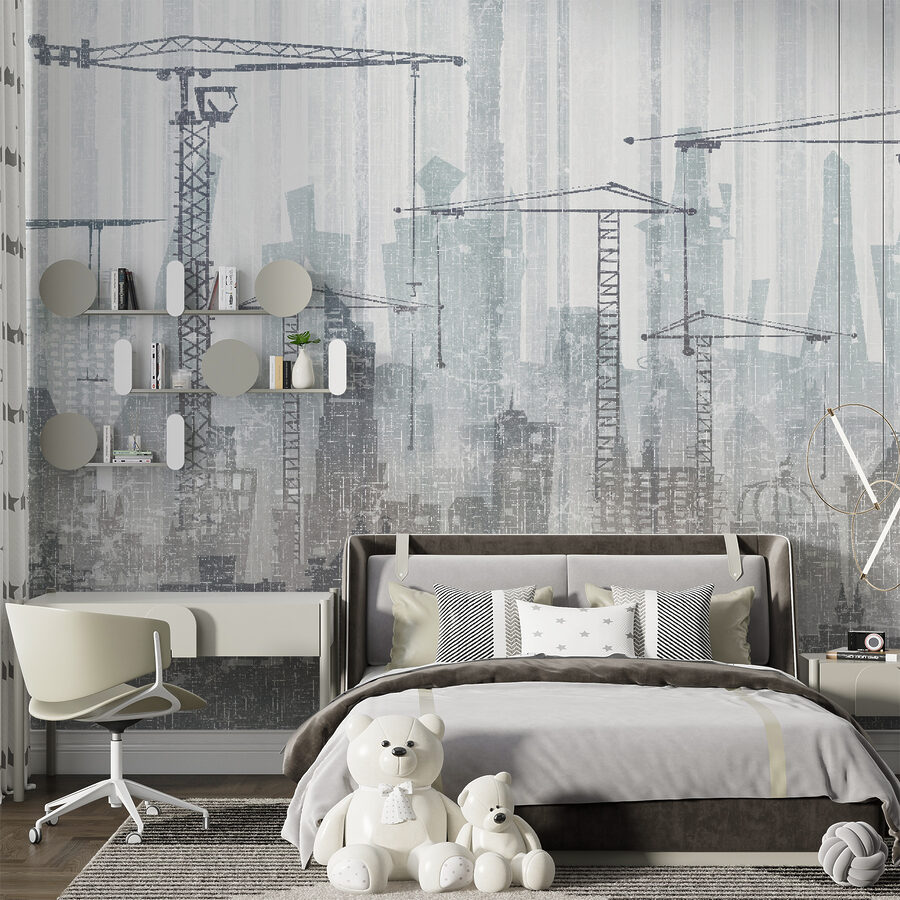 Δείτε αυτή την έξυπνη τοιχογραφία, “Τοπίο πόλης με γερανούς” – ιδανική για όσους αρέσκονται σε δροσερά αστικά vibes. Φανταστείτε να κοιτάζετε τον τοίχο σας και να βλέπετε αυτό το τολμηρό, γεωμετρικό σχέδιο γερανών που στέκονται ψηλά σε ένα μοντέρνο σκηνικό πόλης. Έχει αυτή τη μοντέρνα, ημιτελή εμφάνιση που βλέπετε στην καλύτερη διακόσμηση βιομηχανικού στυλ. Τα σιωπηλά γκρι και λευκά μπορεί να ακούγονται απλά, αλλά δημιουργούν αυτό το φοβερό τρισδιάστατο βάθος που σας κάνει σχεδόν να αισθάνεστε ότι βρίσκεστε στη μέση ενός πολυσύχναστου εργοταξίου – χωρίς τον θόρυβο, ευτυχώς!
