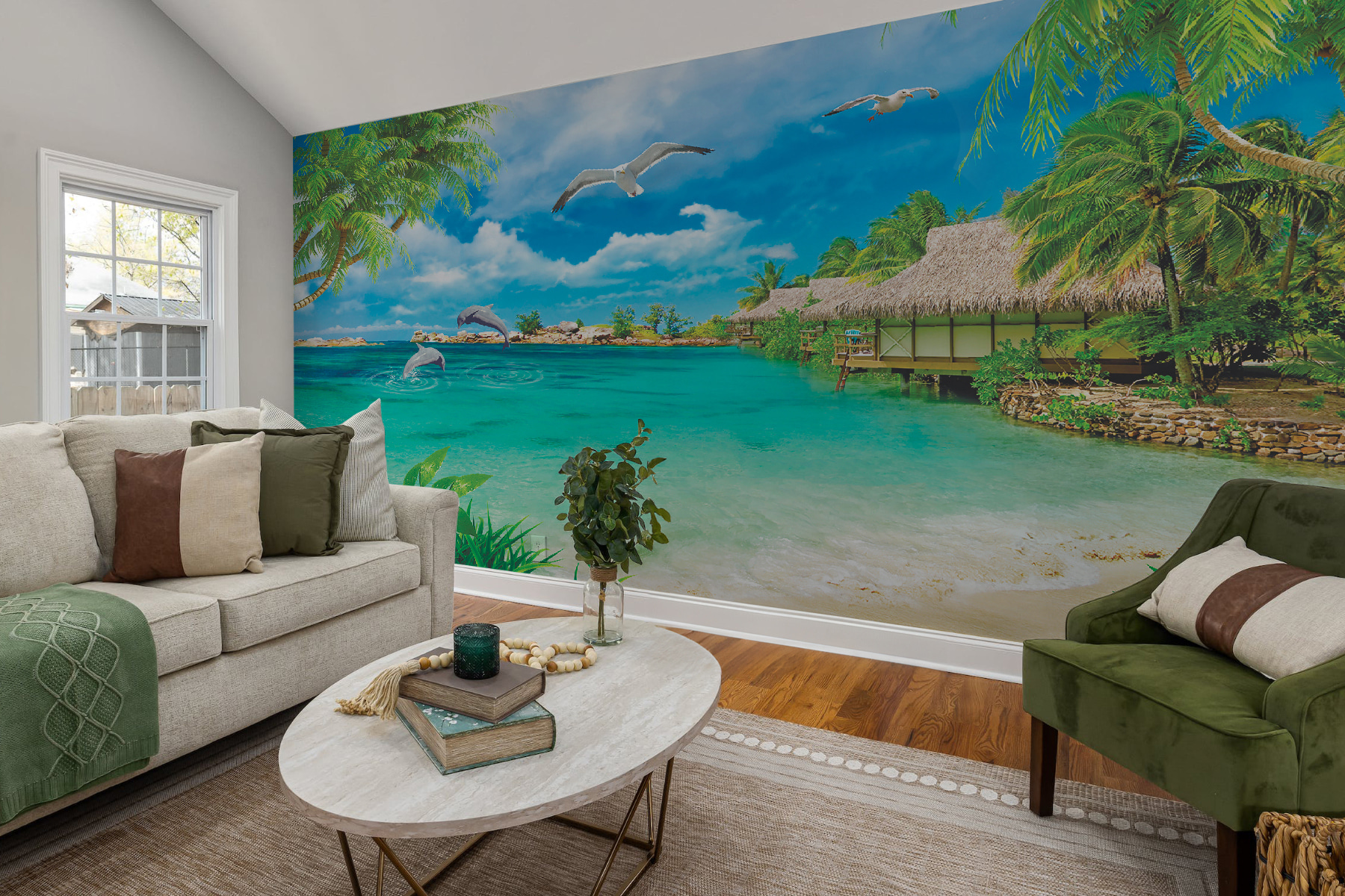 Μεταμορφώστε το χώρο σας σε μια τροπική απόδραση με αυτή την εκπληκτική τοιχογραφία ενός λευκού πουλιού που πετάει μέσα από έναν καταγάλανο ουρανό. Φανταστείτε να ξυπνάτε κάθε πρωί και να νιώθετε ότι βρίσκεστε σε διακοπές στην παραλία – φοίνικες που λικνίζονται, κύματα που χτυπούν απαλά την ακτή και δελφίνια που κάνουν παιχνιδιάρικα άλματα μόνο για εσάς. Τα χρώματα είναι τόσο ζωηρά που μπορεί να σας κάνουν να ξεχάσετε τη μέρα της μπουγάδας. Αυτό το ζωντανό έργο τέχνης φέρνει μια ήρεμη, γαλήνια ατμόσφαιρα σε κάθε δωμάτιο, είτε πρόκειται για ένα άνετο σαλόνι είτε για ένα ζωντανό γραφείο. Ιδανικό για τους ονειροπόλους και τους λάτρεις της παραλίας, είναι σαν να προσκαλείτε το καλοκαίρι στο σπίτι σας όλο το χρόνο. Ποιος δεν θα ήθελε να του θυμίζουν τις τεμπέλικες, ηλιόλουστες μέρες; Ένα μικρό κομμάτι του παραδείσου στον τοίχο σας!