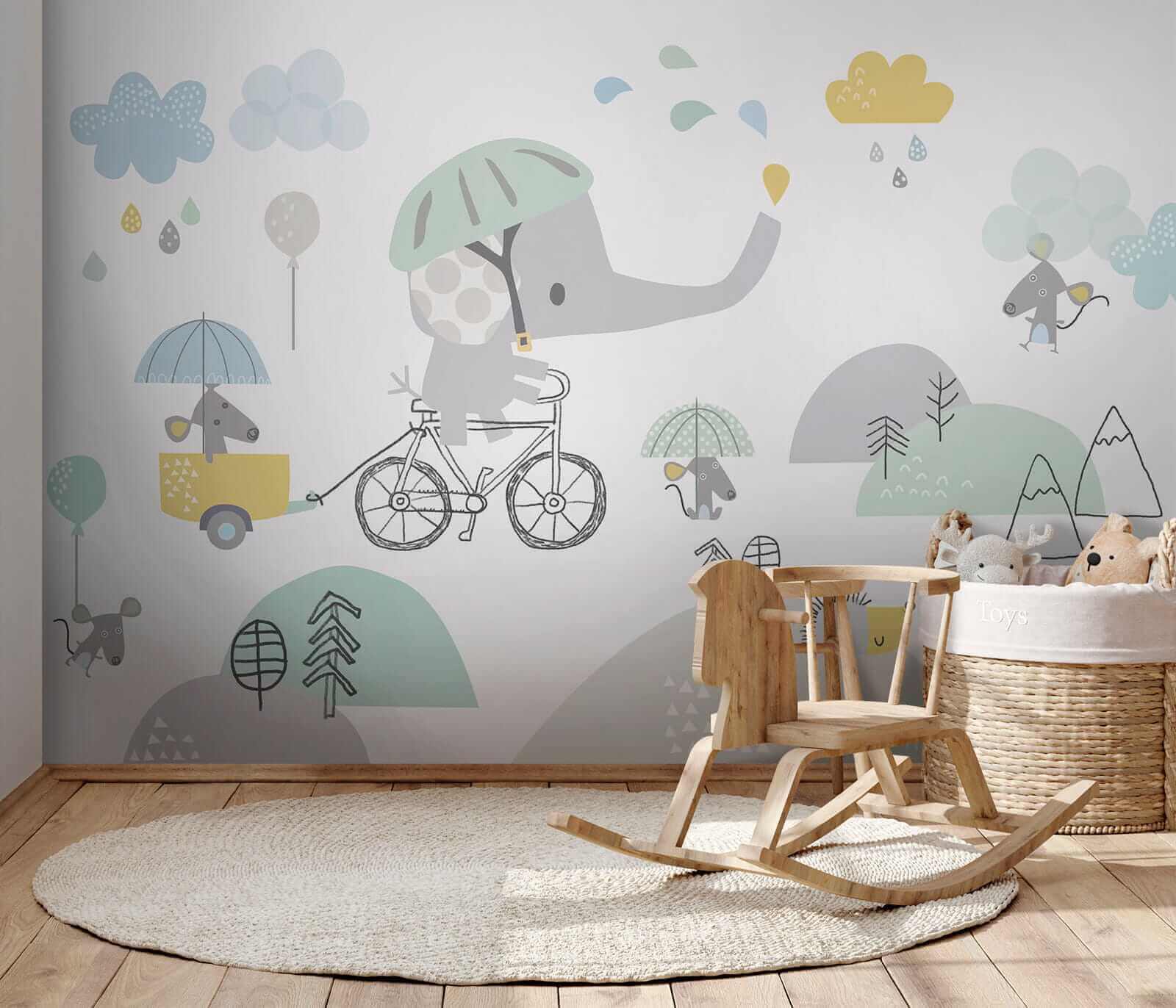 Brighten up any child’s room with this delightfully whimsical mural featuring a cartoon elephant on a bicycle—who wouldn’t want to see that? Imagine little ones gazing at this big guy, pedaling through a soft landscape with his animal pals. It’s like a storybook come to life! The playful colors and cute characters invite smiles, making it the perfect backdrop for adventures. Picture the giggles as kids share their own tales of escapades with this cheerful elephant. It’s more than decor; it’s a daily dose of joy! Perfect for sparking imagination.