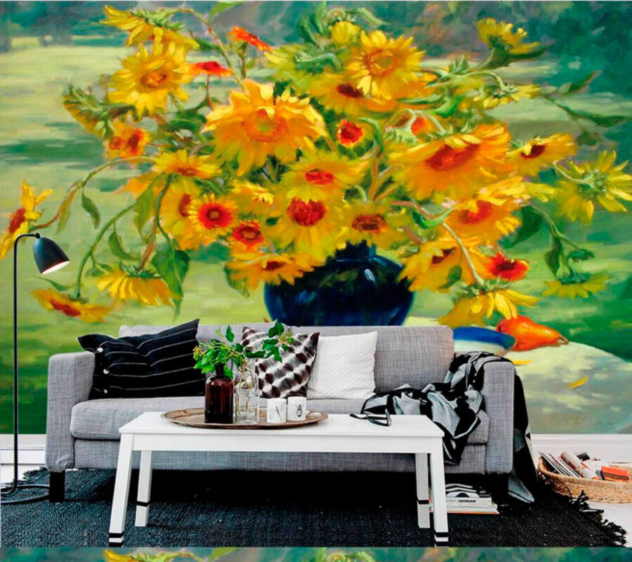 Μεταμορφώστε οποιοδήποτε δωμάτιο σε ένα χαρούμενο καταφύγιο με αυτή την εκπληκτική τοιχογραφία ενός βάζου που ξεχειλίζει από κίτρινα λουλούδια και ζωηρά φρούτα. Φανταστείτε να ξυπνάτε με αυτή την ηλιόλουστη σκηνή – είναι σαν ένα μικρό κομμάτι της φύσης μέσα στο σπίτι σας. Είναι ιδανικό για να προσθέσετε μια πινελιά χρώματος σε μια κουζίνα ή να φωτίσετε ένα άνετο σαλόνι. Οι ζωηρές λεπτομέρειες το κάνουν να μοιάζει σχεδόν τρισδιάστατο, τραβώντας το μάτι και κάνοντάς το εύκολο να χαθεί στην ομορφιά του. Επιπλέον, είναι ένα εξαιρετικό στοιχείο για να ξεκινήσετε μια συζήτηση. Ποιος δεν θα ήθελε να συνομιλήσει για τη μεγάλη χαρά που φέρνουν αυτά τα χαρούμενα άνθη; Μια πινελιά γοητείας, μια δόση ιδιοτροπίας – αυτή η τοιχογραφία είναι βέβαιο ότι θα ανεβάσει τη διάθεση και θα προκαλέσει χαμόγελα.
