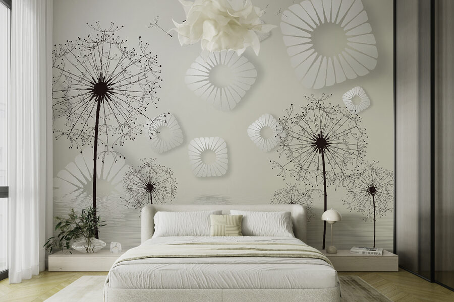 Η μεταμόρφωση ενός χώρου μπορεί να μοιάζει με μαγεία, και αυτή η τοιχογραφία αποτυπώνει τέλεια αυτό το κλίμα. Φανταστείτε να μπαίνετε σε ένα δωμάτιο ζωγραφισμένο με ντελικάτες πικραλίδες, με τις μαγευτικές, αραχνοΰφαντες μορφές τους να προσκαλούν σε ονειροπολήσεις και ιδιοτροπίες. Τα λευκά κυκλικά σχέδια αιωρούνται σαν σύννεφα, προσθέτοντας μια ελαφριά, αέρινη πινελιά που μοιάζει φρέσκια και φιλόξενη.