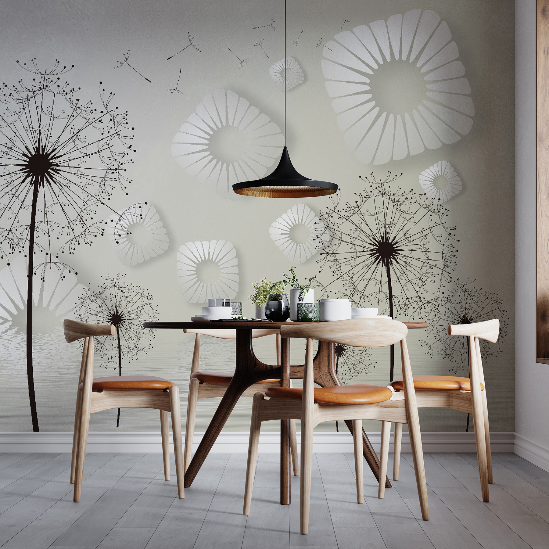 Η μεταμόρφωση ενός χώρου μπορεί να μοιάζει με μαγεία, και αυτή η τοιχογραφία αποτυπώνει τέλεια αυτό το κλίμα. Φανταστείτε να μπαίνετε σε ένα δωμάτιο ζωγραφισμένο με ντελικάτες πικραλίδες, με τις μαγευτικές, αραχνοΰφαντες μορφές τους να προσκαλούν σε ονειροπολήσεις και ιδιοτροπίες. Τα λευκά κυκλικά σχέδια αιωρούνται σαν σύννεφα, προσθέτοντας μια ελαφριά, αέρινη πινελιά που μοιάζει φρέσκια και φιλόξενη.