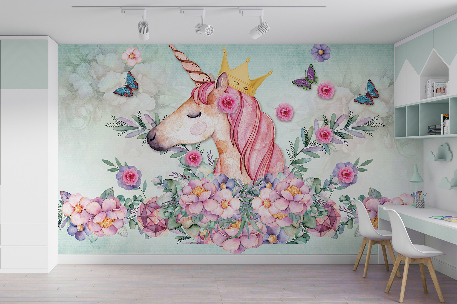 Καλωσορίστε μια πινελιά ιδιόρρυθμης μαγείας στο δωμάτιο του παιδιού σας με αυτή τη μαγευτική τοιχογραφία! Με έναν χαριτωμένο μονόκερο που φοράει στέμμα, περιτριγυρισμένο από ντελικάτα λουλούδια και πεταλούδες που φτερουγίζουν, είναι σαν να μπαίνετε κάθε μέρα σε ένα παραμύθι. Φανταστείτε τα μάτια του μικρού σας να φωτίζονται από χαρά και θαυμασμό – απόλυτη ευτυχία!