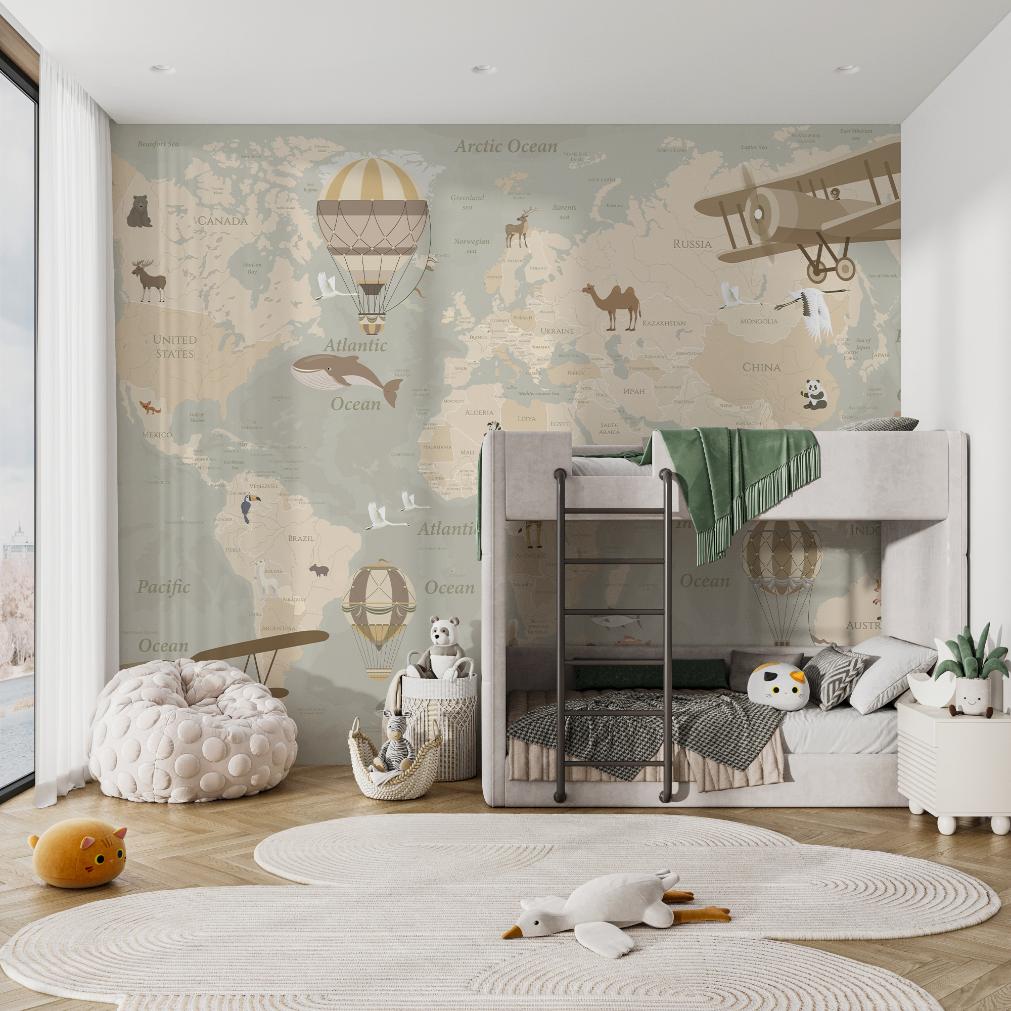 Φανταστείτε τον μικρό σας εξερευνητή να ξεκινάει για φανταστικές περιπέτειες – τη μια μέρα, πετάει με ένα διπλάνο πάνω από την Αφρική και την επόμενη, αιωρείται σε ένα αερόστατο πάνω από την Αυστραλία. Είναι ιδανικό για να κεντρίσει την περιέργεια και να μετατρέψει τους τοίχους σε καμβά ονείρων. Επιπλέον, έχει αυτή την υπέροχη vintage ατμόσφαιρα που μπορούν να εκτιμήσουν και οι ενήλικες – σαν ένα έργο τέχνης και ένα μάθημα γεωγραφίας μαζί. Ευφάνταστο και ταυτόχρονα εκπαιδευτικό, κάνει κάθε ματιά σε μια μίνι-διακοπή. Γιατί, λοιπόν, να συμβιβαστείτε με απλούς τοίχους όταν μπορείτε να έχετε έναν ολόκληρο κόσμο που περιμένει να εξερευνηθεί;