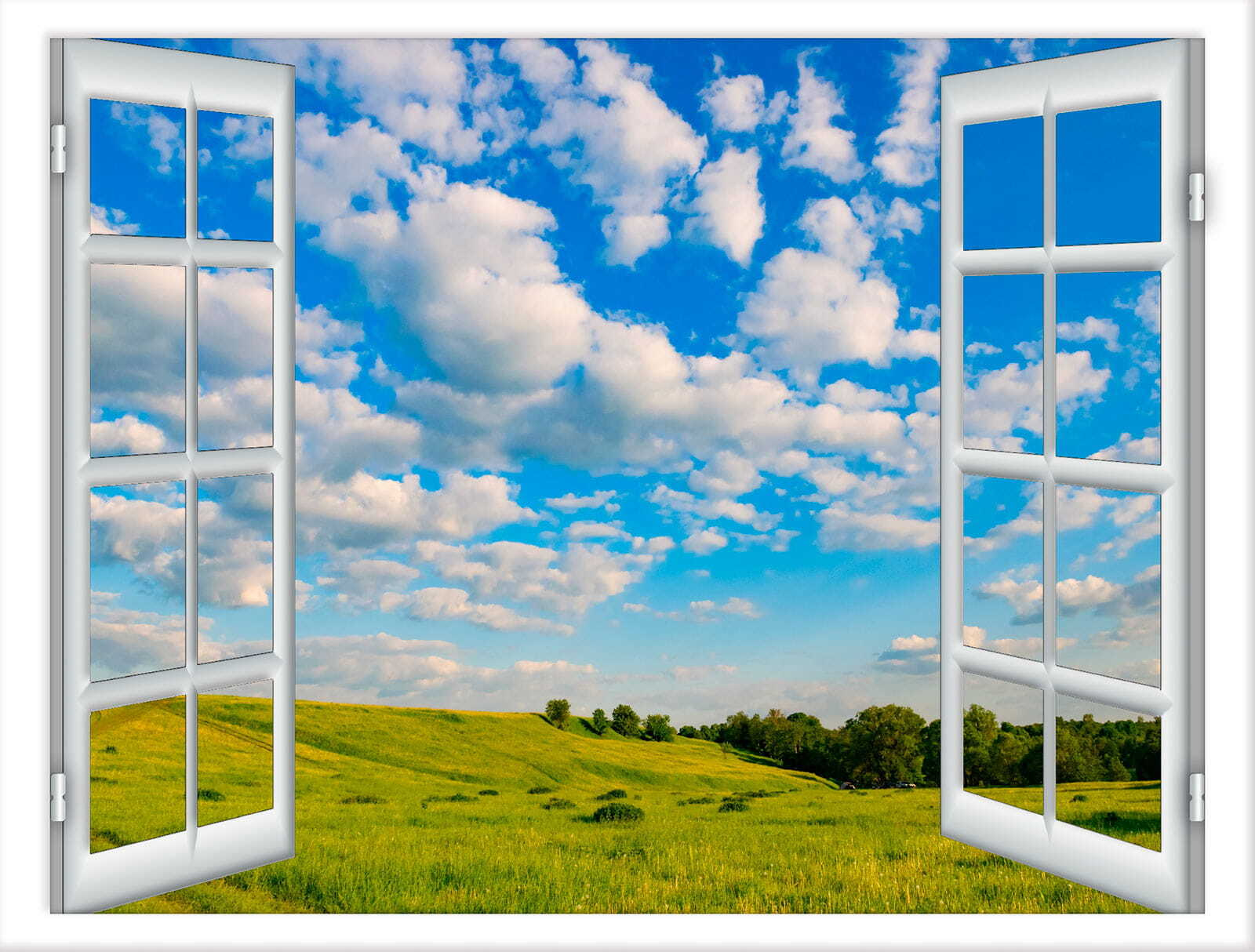 Φανταστείτε αυτό: μια ζεστή γωνιά, ίσως μια γωνιά ανάγνωσης ή εκείνο το σημείο όπου ο πρωινός καφές είναι πραγματικά ιδανικός. Τώρα, φανταστείτε να κοιτάζετε έξω έναν εκπληκτικό μπλε ουρανό διάστικτο με χνουδωτά σύννεφα, και όλα αυτά χωρίς να βγείτε από το σπίτι σας. Αυτή η τοιχογραφία τοίχου, σε σχήμα παραθύρου σε ένα γαλήνιο τοπίο, ζωντανεύει αυτό το τέλειο όνειρο. Είναι σαν μια μίνι-διακοπή κάθε μέρα! Οι ζωηρές αποχρώσεις και η ανοιχτή αίσθηση φωτίζουν αβίαστα κάθε δωμάτιο. Φανταστείτε τους φίλους σας να περνούν και να τους τραβάει αμέσως αυτή η χαρούμενη θέα. Μια ματιά μόνο, και μεταφέρονται σε αυτό το ηλιόλουστο λιβάδι. Ποιος θα μπορούσε να φανταστεί ότι ένας τοίχος θα μπορούσε να εμπνεύσει τέτοια περιπλάνηση;