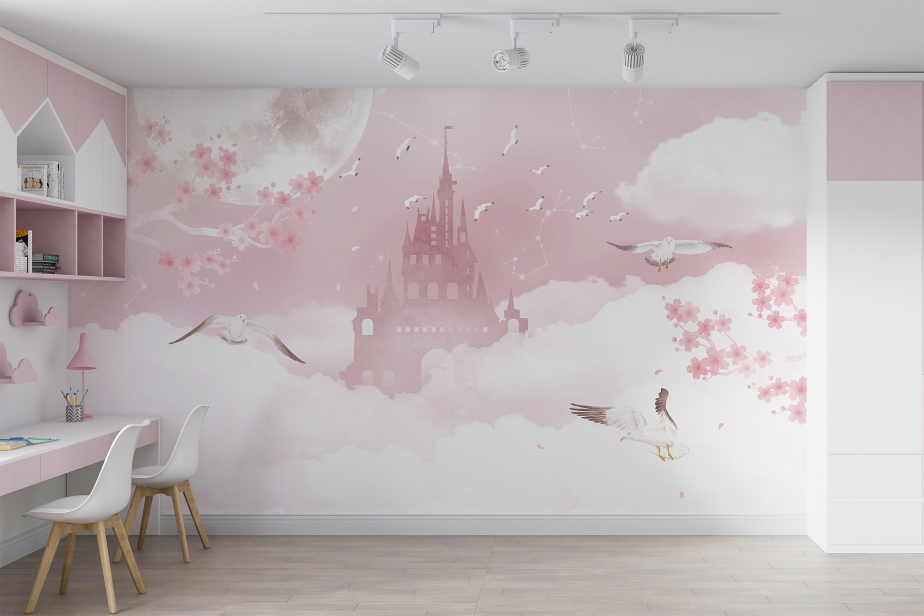 Φανταστείτε ένα μικρό κορίτσι ξαπλωμένο στο κρεβάτι, να ατενίζει αυτή την τοιχογραφία και να αποκοιμιέται σε έναν κόσμο όπου μπορεί να πετάξει με τα πουλιά ή να εξερευνήσει κρυμμένα κάστρα. Τα γαλήνια χρώματα και τα γοητευτικά στοιχεία δημιουργούν έναν τόσο ηρεμιστικό και ευφάνταστο χώρο. Δεν είναι απλώς μια τοιχογραφία – είναι μια περιπέτεια που ξεκινά κάθε φορά που μπαίνει στο δωμάτιό της!