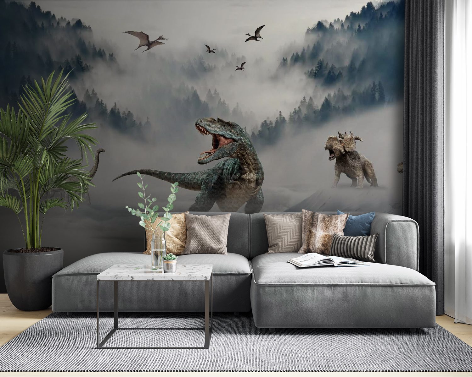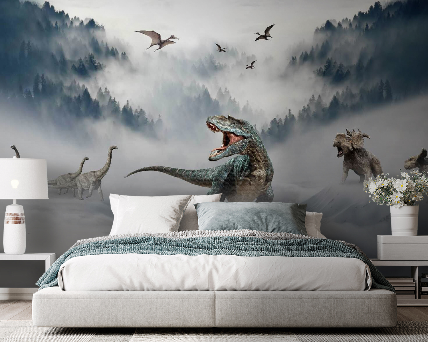 Έχετε έναν λάτρη των δεινοσαύρων στο σπίτι; Αυτή η τοιχογραφία τοίχου “Δεινόσαυρος με ανοιχτό στόμα” μπορεί να τους ξετρελάνει! Φανταστείτε το: άγριος T-Rex να βρυχάται μέσα σε ομιχλώδη, πυκνά δάση, με μακρυχέρηδες φίλους και ιπτάμενους προϊστορικούς φίλους να αιωρούνται στο παρασκήνιο. Ιδανικό για παιδικά δωμάτια, παιδικά δωμάτια ή για όποιον αγαπάει λίγη από την Ιουρασική συγκίνηση στη διακόσμησή του. Φανταστείτε τα αναστεναγμοί δέους των μικρών επισκεπτών – και τους παιχνιδιάρικους βρυχηθμούς που θα ακολουθήσουν! Αυτή η τοιχογραφία δεν είναι απλώς ένας τοίχος, είναι μια περιπέτεια που περιμένει να συμβεί. Είναι τολμηρή, είναι άγρια και είναι έτοιμη να σας μεταφέρει πίσω στο χρόνο! 🦖🌲