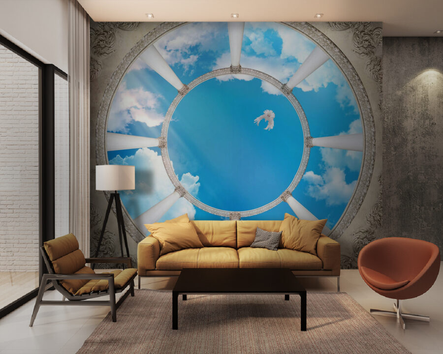 Φανταστείτε να μπαίνετε σε ένα δωμάτιο όπου ένας εντυπωσιακός ουρανός συναντά κομψές κολώνες, ενώ ένα πουλί πετάει από πάνω. Αυτή η τοιχογραφία, με το τρισδιάστατο εφέ της, μεταμορφώνει αμέσως κάθε χώρο σε μια ονειρική απόδραση. Είναι σαν να έχετε ένα κομμάτι από την ύπαιθρο, ακριβώς στο σαλόνι σας. Οι φίλοι μπορεί να σταματήσουν στη μέση της συζήτησης, να κοιτάξουν ψηλά και να αναρωτηθούν αν έχουν γλιστρήσει σε μια μεγάλη αίθουσα ή σε έναν γαλήνιο ουρανό.