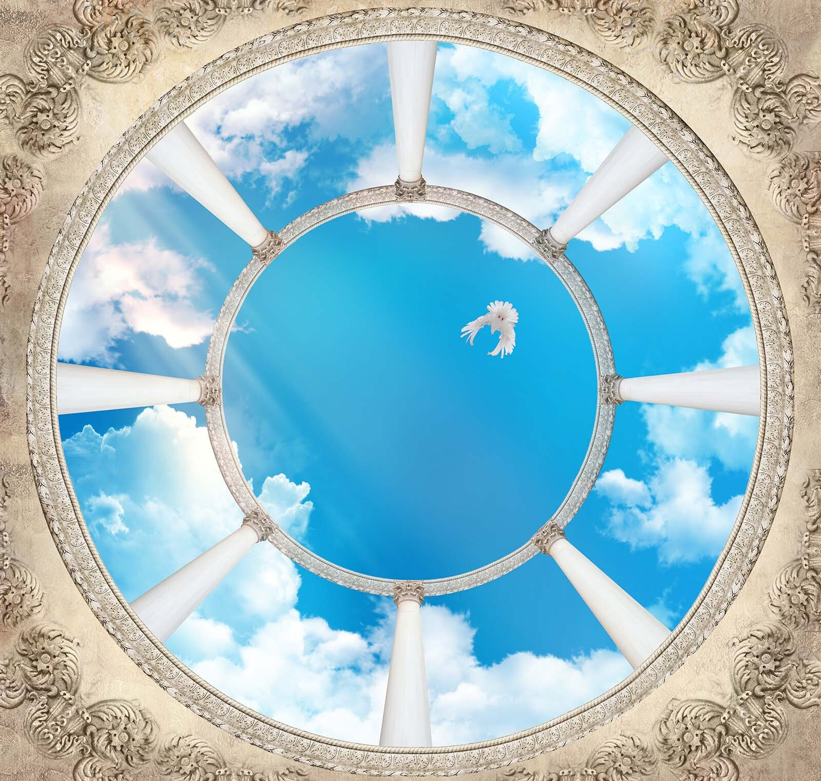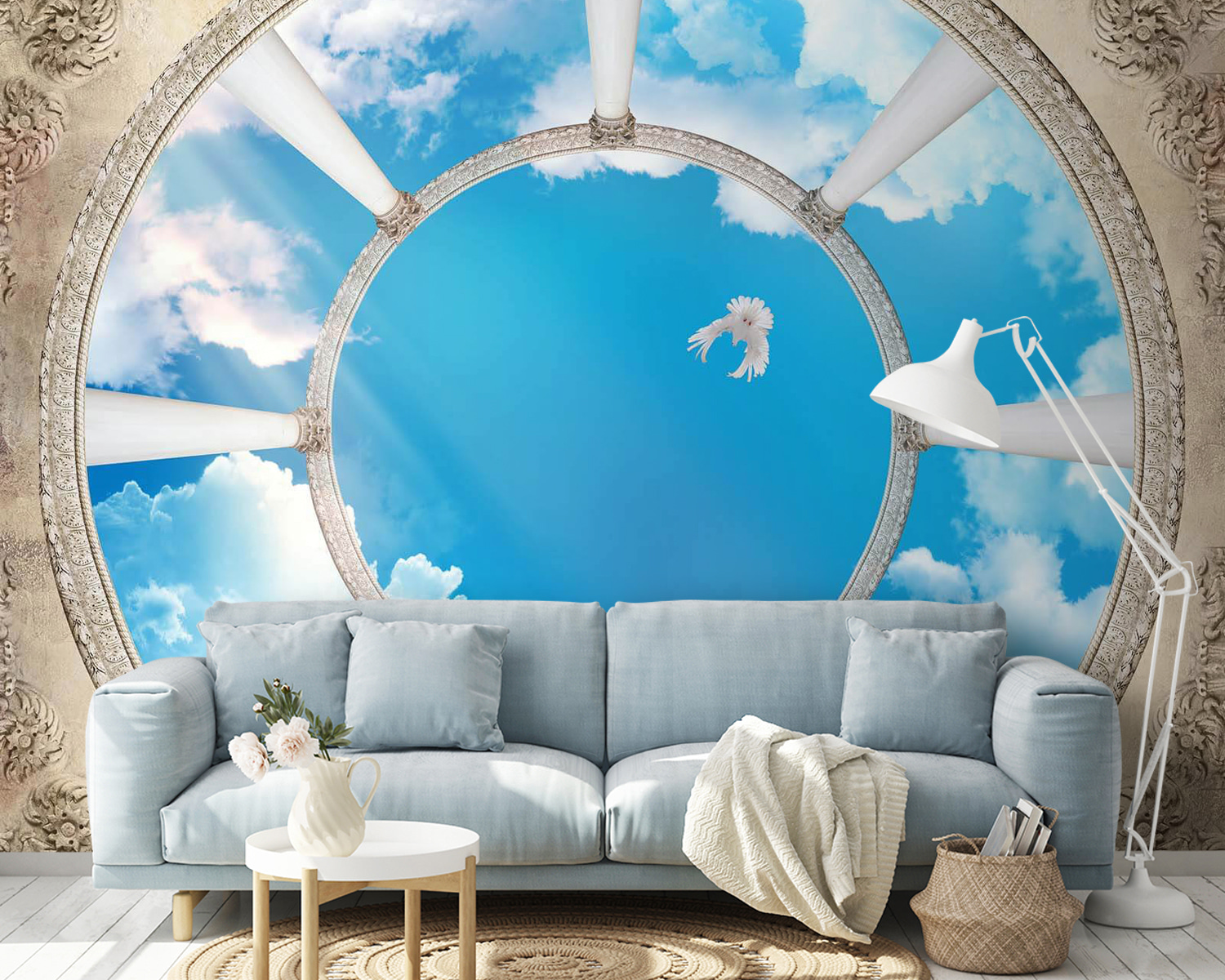 Φανταστείτε να μπαίνετε σε ένα δωμάτιο όπου ένας εντυπωσιακός ουρανός συναντά κομψές κολώνες, ενώ ένα πουλί πετάει από πάνω. Αυτή η τοιχογραφία, με το τρισδιάστατο εφέ της, μεταμορφώνει αμέσως κάθε χώρο σε μια ονειρική απόδραση. Είναι σαν να έχετε ένα κομμάτι από την ύπαιθρο, ακριβώς στο σαλόνι σας. Οι φίλοι μπορεί να σταματήσουν στη μέση της συζήτησης, να κοιτάξουν ψηλά και να αναρωτηθούν αν έχουν γλιστρήσει σε μια μεγάλη αίθουσα ή σε έναν γαλήνιο ουρανό.