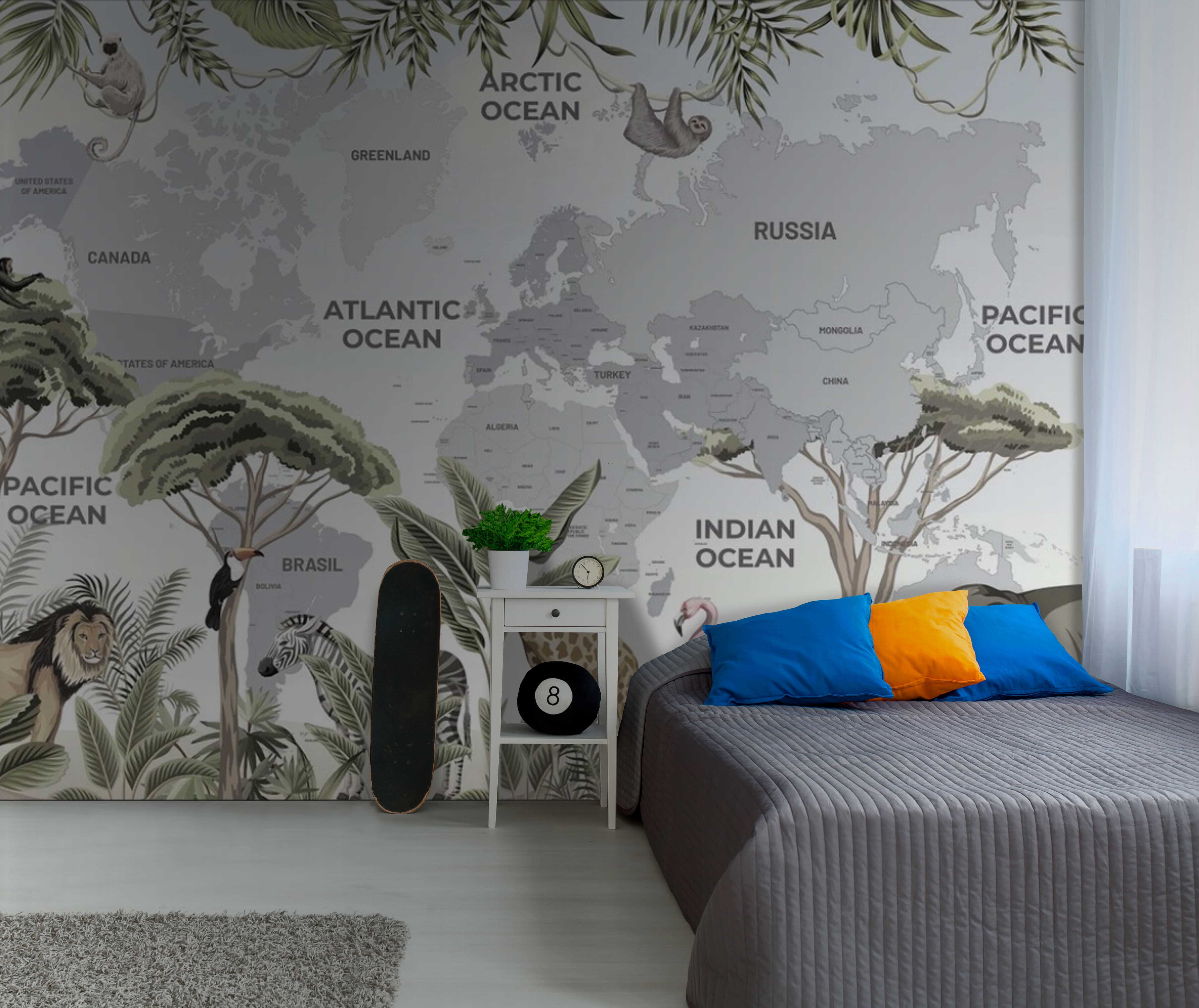 Φανταστείτε να φέρετε ένα κομμάτι της άγριας φύσης στο χώρο σας με αυτή την υπέροχη τοιχογραφία! Η “Καμηλοπάρδαλη που στέκεται δίπλα σε ένα δέντρο” συνδυάζει τέλεια τα γοητευτικά ζώα με ένα παγκόσμιο φόντο χάρτη. Είναι σαν ένα μίνι σαφάρι – χωρίς το τζετ λαγκ. Φανταστείτε τα μικρά παιδιά να θαυμάζουν την καμηλοπάρδαλη, να εντοπίζουν το φλαμίνγκο, να μαντεύουν τις ηπείρους… και όλα αυτά ενώ μαθαίνουν γεωγραφία με τον πιο υπέροχο τρόπο. Κάθε φορά που περνάτε από εκεί, δεν μπορείτε παρά να χαμογελάσετε με τον παιχνιδιάρη βραδύποδα που τριγυρνάει τριγύρω. Δεν είναι απλώς μια τοιχογραφία – είναι έναυσμα για συζήτηση, έναυσμα για ονειροπόληση, ένα μικρό κομμάτι περιπέτειας! Ιδανική για παιδικά δωμάτια, είναι γεμάτη με απολαυστικές λεπτομέρειες που θα μεγαλώσουν την περιέργειά τους για τον κόσμο.