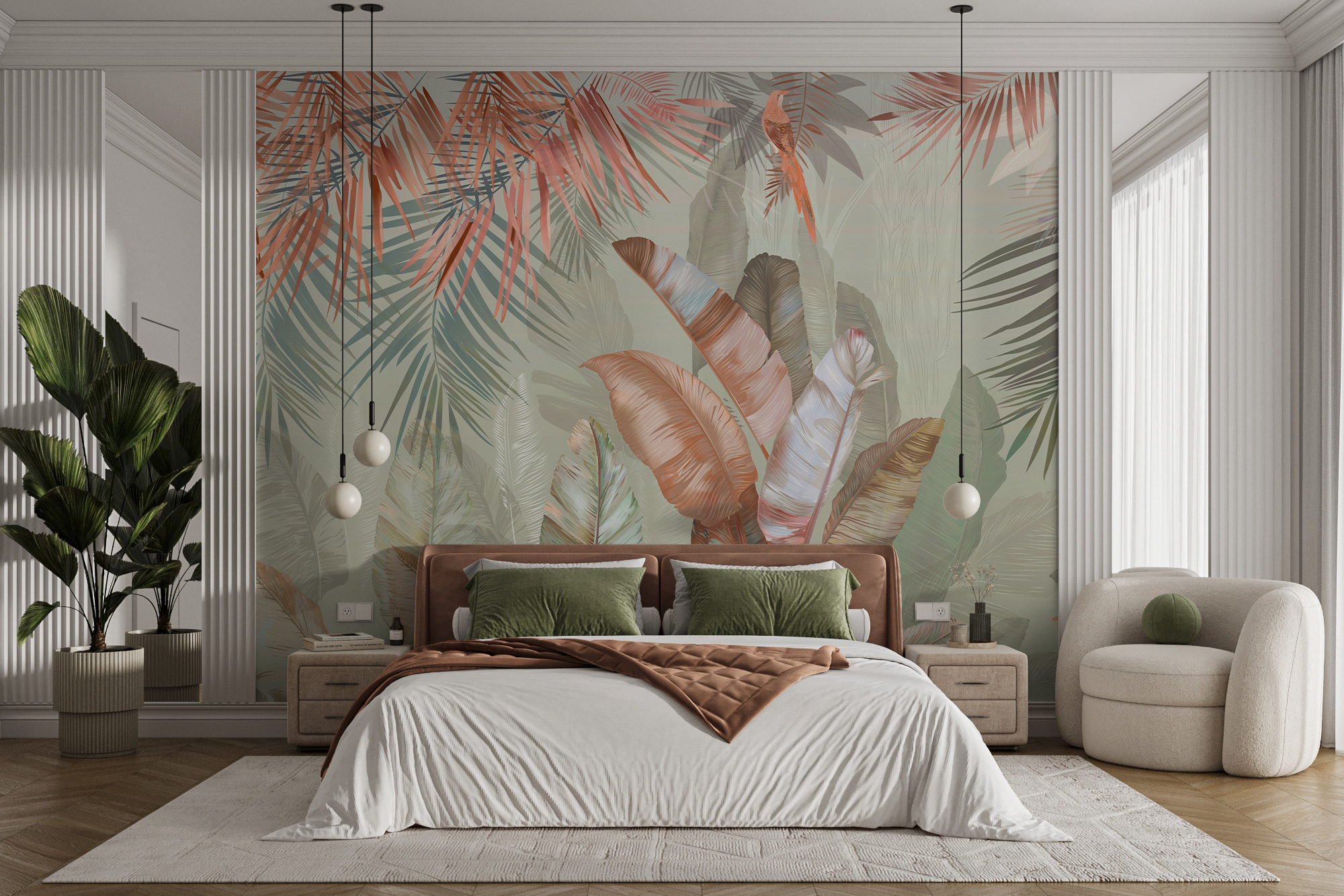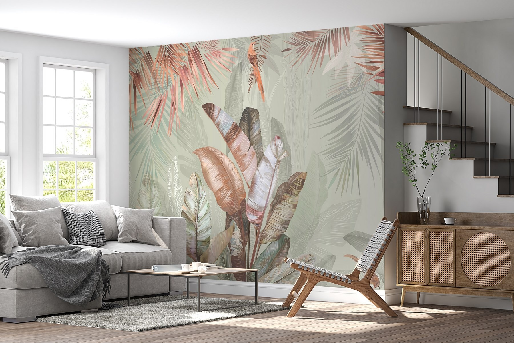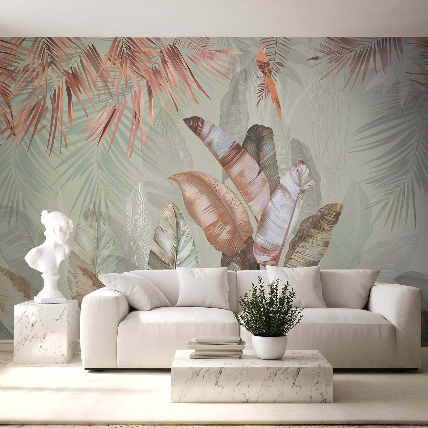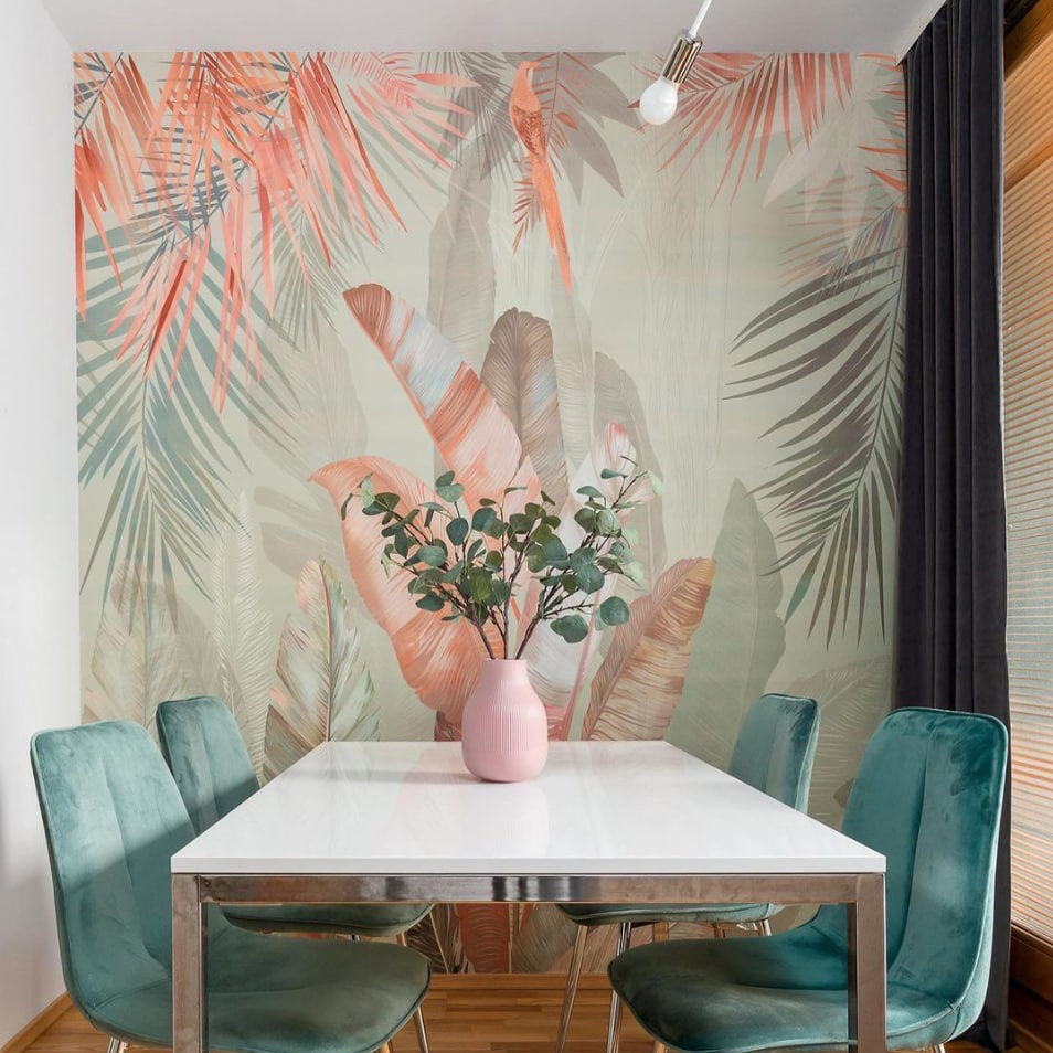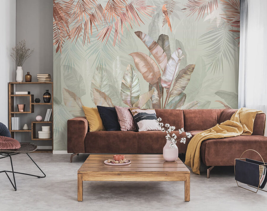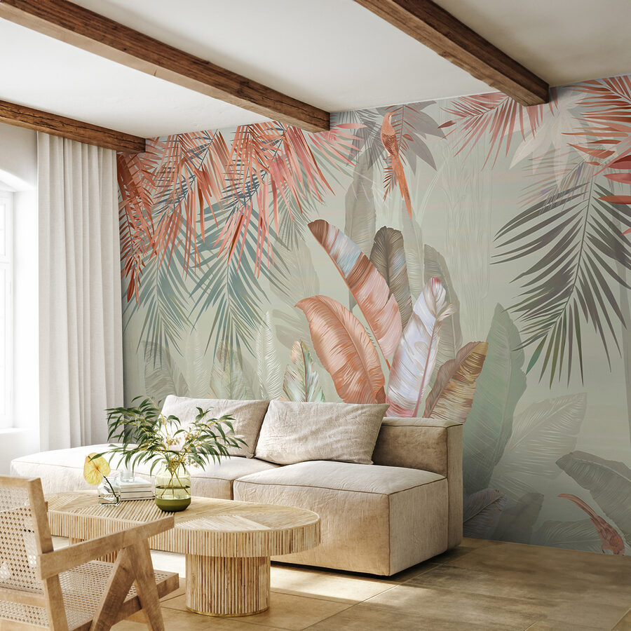 Μεταμορφώστε το χώρο σας με αυτή την υπέροχη τοιχογραφία με τροπικά φύλλα σε απαλές παστέλ αποχρώσεις. Φανταστείτε το: ξυπνώντας σε ένα ηλιόλουστο δωμάτιο όπου η φύση ψιθυρίζει μέσα από την τέχνη. Αυτά τα απαλά πράσινα και οι κοκκινωποί τόνοι προσκαλούν μια ήρεμη ατμόσφαιρα, ιδανική για αυτή τη ζεστή γωνιά ή ακόμα και για ένα φωτεινό σαλόνι. Φανταστείτε να πίνετε τον καφέ σας μια βροχερή μέρα, νιώθοντας σαν να αράζετε σε μια γαλήνια ζούγκλα. Είναι σαν μια μίνι-διακοπή ακριβώς στον τοίχο σας. Επιπλέον, είναι μια εξαιρετική αφορμή για συζήτηση – οι επισκέπτες θα είναι περίεργοι για την έμπνευση πίσω από αυτή την ηρεμιστική ομορφιά.