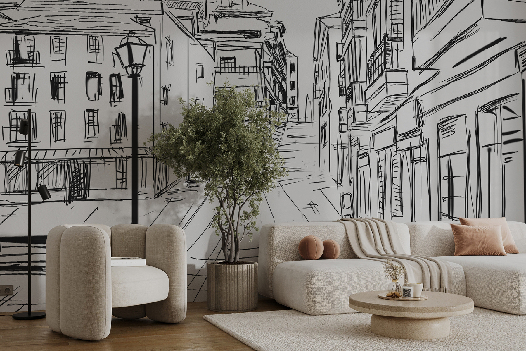 Φανταστείτε να χαλαρώνετε στο σαλόνι σας με αυτή την εκπληκτική ασπρόμαυρη τοιχογραφία στον τοίχο σας. Είναι σαν ένα ιδιόρρυθμο σκίτσο που ζωντανεύει! Οι παιχνιδιάρικες γραμμές που αποτυπώνουν ένα αστικό σκηνικό -με ένα μοναχικό παγκάκι και πανύψηλα κτίρια- φέρνουν μια καλλιτεχνική ατμόσφαιρα που θα σας κάνει να ονειρεύεστε ευρωπαϊκούς δρόμους.