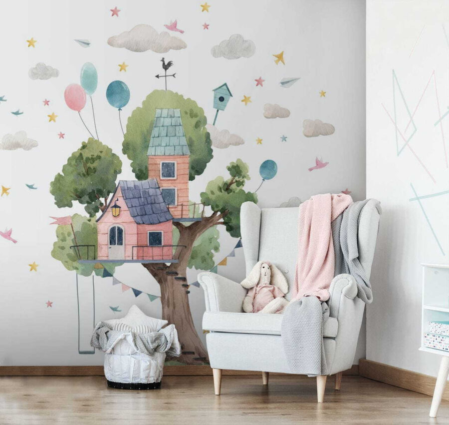 Φανταστείτε ένα φανταστικό δεντρόσπιτο, που αιωρείται σε έναν ονειρικό κόσμο ακουαρέλας. Αυτή η τοιχογραφία δεν είναι απλώς μια εικόνα, είναι μια πρόσκληση για περιπέτεια! Φέρνει την ουσία της παιδικής ηλικίας σε κάθε δωμάτιο, ιδανική για να πυροδοτήσει τη φαντασία. Τα παστέλ χρώματα, τα παιχνιδιάρικα μπαλόνια και τα γοητευτικά πουλιά μπορούν να μεταφέρουν τον καθένα πίσω σε εκείνες τις ανέμελες μέρες που σκαρφάλωναμε στα δέντρα και ονειρευόμασταν. Φανταστείτε το: μια ζεστή γωνιά όπου η φαντασία τρέχει ελεύθερη, τα παιδιά γελάνε με φανταστικά πάρτι τσαγιού στην κορυφή των δέντρων. Αυτή η τοιχογραφία μπορεί εύκολα να γίνει το επίκεντρο ενός μαγικού χώρου, προσφέροντας χαρά και θαυμασμό για τα επόμενα χρόνια!