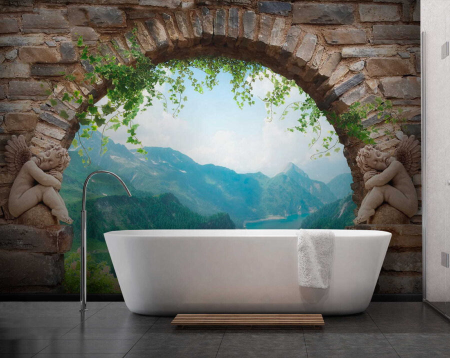 Φανταστείτε να περνάτε μέσα από μια ρουστίκ πέτρινη αψίδα που οδηγεί κατευθείαν σε μια εκπληκτική θέα στην κοιλάδα. Αυτή η τοιχογραφία δεν είναι απλώς μια διακόσμηση, αλλά μια μικρή περιπέτεια κάθε μέρα. Φανταστείτε να πίνετε τον πρωινό σας καφέ, ενώ ατενίζετε το πλούσιο πράσινο και το λαμπερό νερό κάτω από σας. Τα παιχνιδιάρικα αγγελούδια σε κάθε πλευρά προσθέτουν μια πινελιά ιδιοτροπίας, κάνοντάς το να μοιάζει με σκηνή από παραμύθι. Ιδανική για ένα σαλόνι ή μια ζεστή γωνιά, αυτή η τοιχογραφία μεταμορφώνει κάθε χώρο σε μια ονειρική απόδραση. Είναι σαν να έχετε ένα μικρό κομμάτι της φύσης ακριβώς στον τοίχο σας, προσκαλώντας αβίαστα μια αίσθηση ηρεμίας και θαυμασμού στην καθημερινή ζωή. Απλά μην ξεχάσετε να ποτίσετε αυτά τα φανταστικά φυτά!