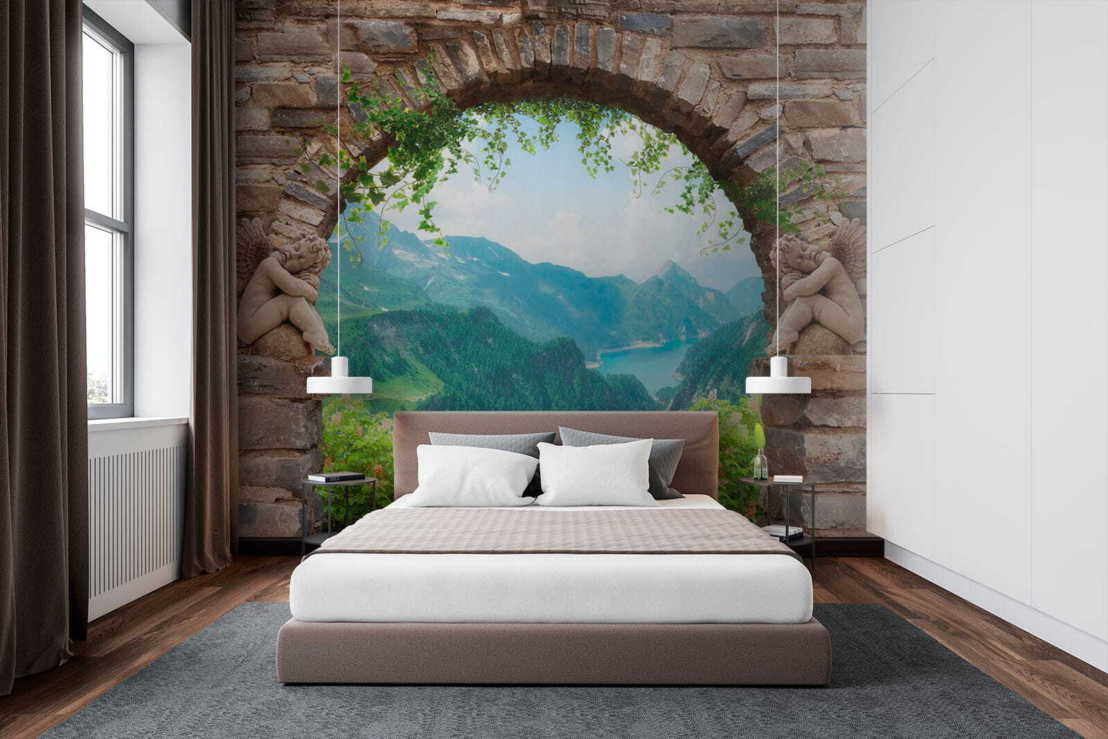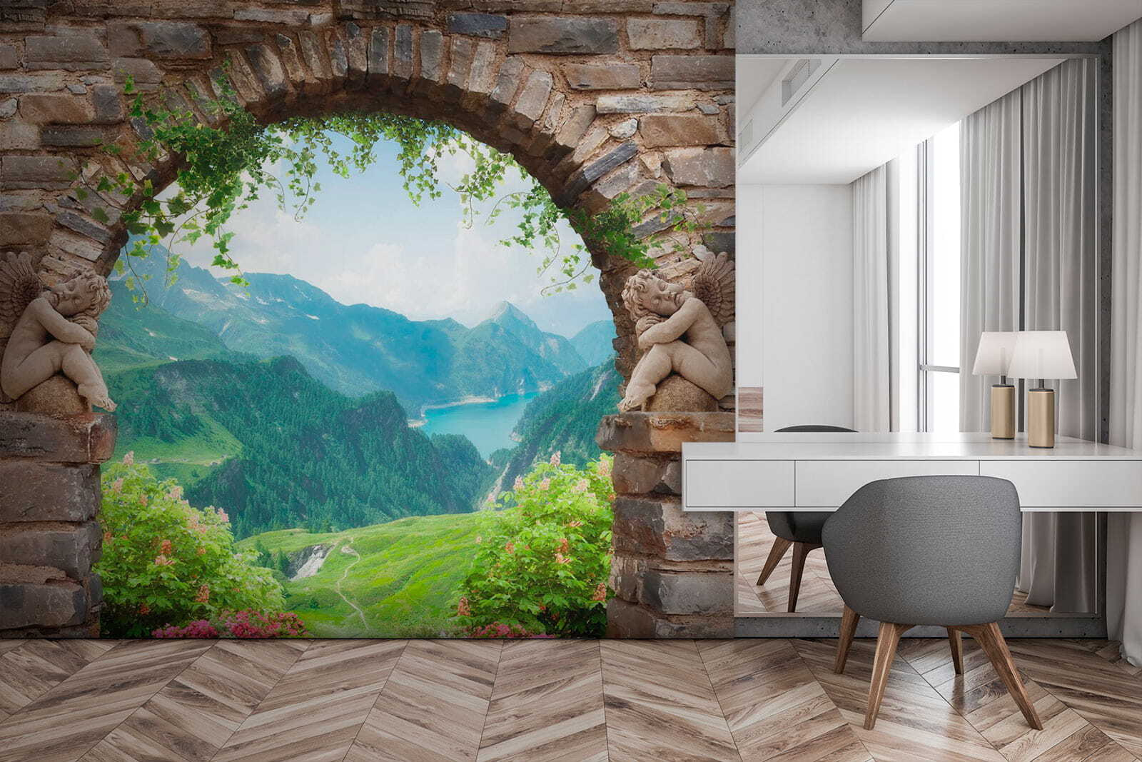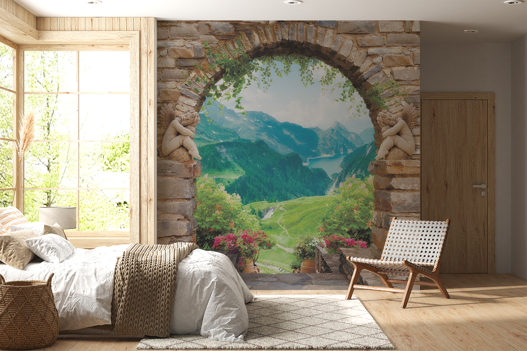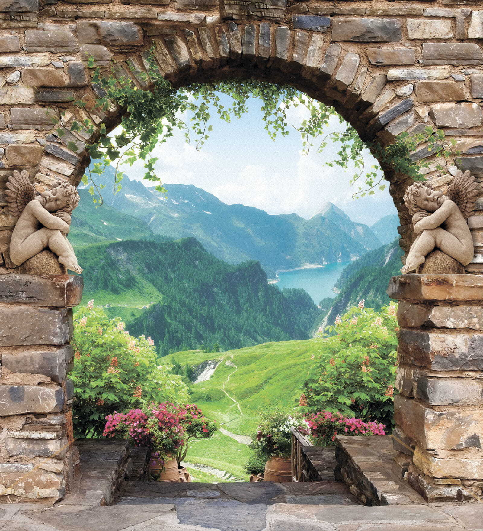 Φανταστείτε να περνάτε μέσα από μια ρουστίκ πέτρινη αψίδα που οδηγεί κατευθείαν σε μια εκπληκτική θέα στην κοιλάδα. Αυτή η τοιχογραφία δεν είναι απλώς μια διακόσμηση, αλλά μια μικρή περιπέτεια κάθε μέρα. Φανταστείτε να πίνετε τον πρωινό σας καφέ, ενώ ατενίζετε το πλούσιο πράσινο και το λαμπερό νερό κάτω από σας. Τα παιχνιδιάρικα αγγελούδια σε κάθε πλευρά προσθέτουν μια πινελιά ιδιοτροπίας, κάνοντάς το να μοιάζει με σκηνή από παραμύθι. Ιδανική για ένα σαλόνι ή μια ζεστή γωνιά, αυτή η τοιχογραφία μεταμορφώνει κάθε χώρο σε μια ονειρική απόδραση. Είναι σαν να έχετε ένα μικρό κομμάτι της φύσης ακριβώς στον τοίχο σας, προσκαλώντας αβίαστα μια αίσθηση ηρεμίας και θαυμασμού στην καθημερινή ζωή. Απλά μην ξεχάσετε να ποτίσετε αυτά τα φανταστικά φυτά!
