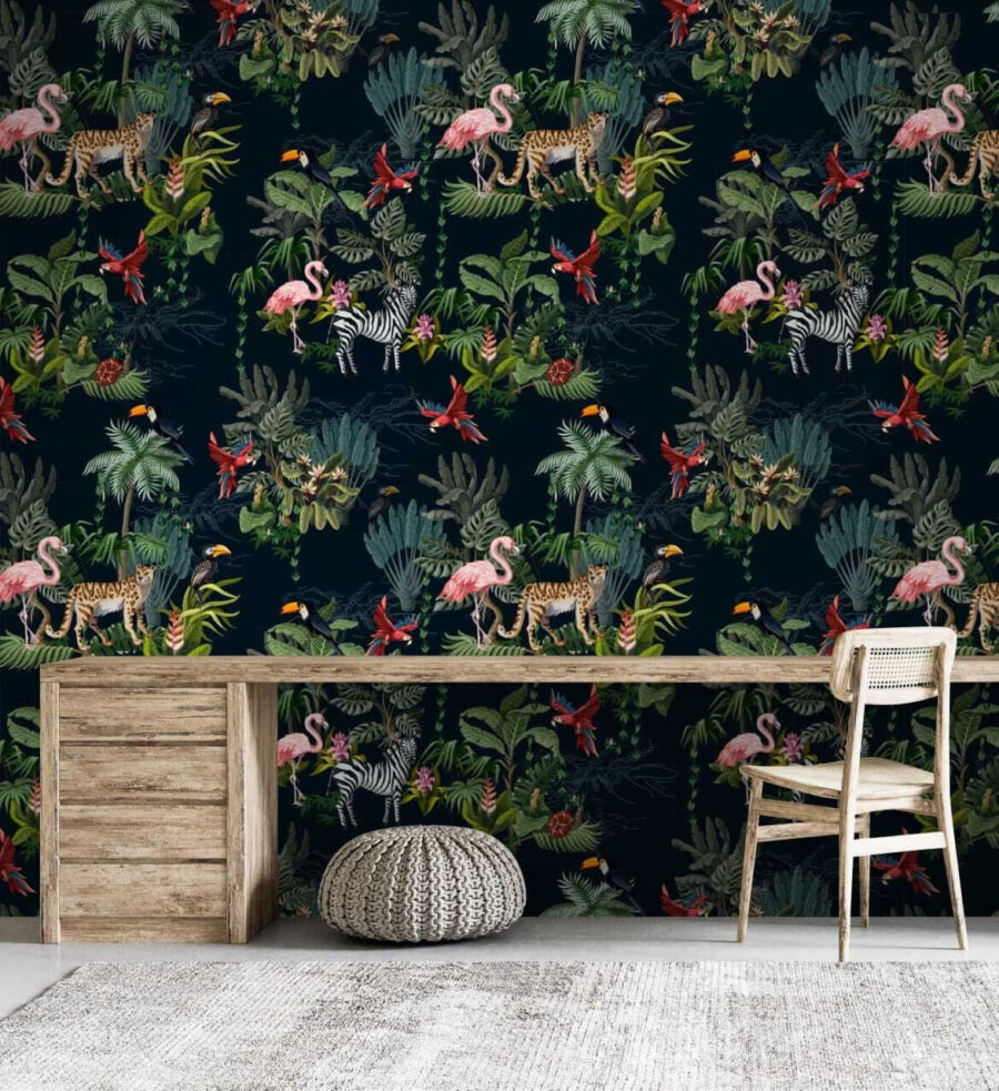 Μεταμορφώστε οποιονδήποτε τοίχο σε ένα ζωντανό καταφύγιο με αυτή την εκπληκτική τοιχογραφία που απεικονίζει φλαμίνγκο και ζέβρες μέσα σε πλούσια τροπική βλάστηση. Είναι σαν να φέρνετε ένα μικρό κομμάτι της άγριας φύσης κατευθείαν στο σαλόνι σας — ή στο μπάνιο σας, αν αισθάνεστε τολμηροί! Φανταστείτε να μπαίνετε σε μια πλούσια ζούγκλα κάθε φορά που περνάτε από μπροστά της. Τα πλούσια χρώματα ξεχωρίζουν σε ένα πιο σκούρο φόντο, καθιστώντας την το ιδανικό σκηνικό για ζεστές συγκεντρώσεις ή Επιπλέον, είναι ένα εξαιρετικό θέμα για να ξεκινήσετε μια συζήτηση — ποιος δεν αγαπά τις συζητήσεις για την εξωτική άγρια φύση; Αυτή η ταπετσαρία δεν είναι απλώς διακόσμηση, είναι μια εμπειρία. Αναβαθμίστε λοιπόν αυτόν τον απλό τοίχο και αφήστε τη ζούγκλα να σας κατακλύσει!