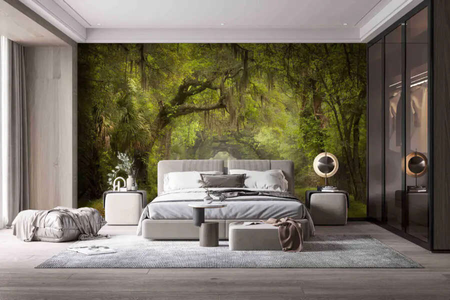 Imagine stepping into a sunny day on a dirt road, where trees dance above, draped in a soft, green veil of moss. This mural isn’t just a wall decoration—it’s an escape, a little slice of nature right in your living room. It invites daydreams of wandering down that path, perhaps encountering a curious deer or just feeling a gentle breeze. Perfect for those who love the outdoors but aren’t ready to give up their cozy indoors. Add a splash of warmth and a hint of adventure to any space, and just like that, every glance can feel like a mini vacation. Who wouldn’t want a front-row seat to such a peaceful view?