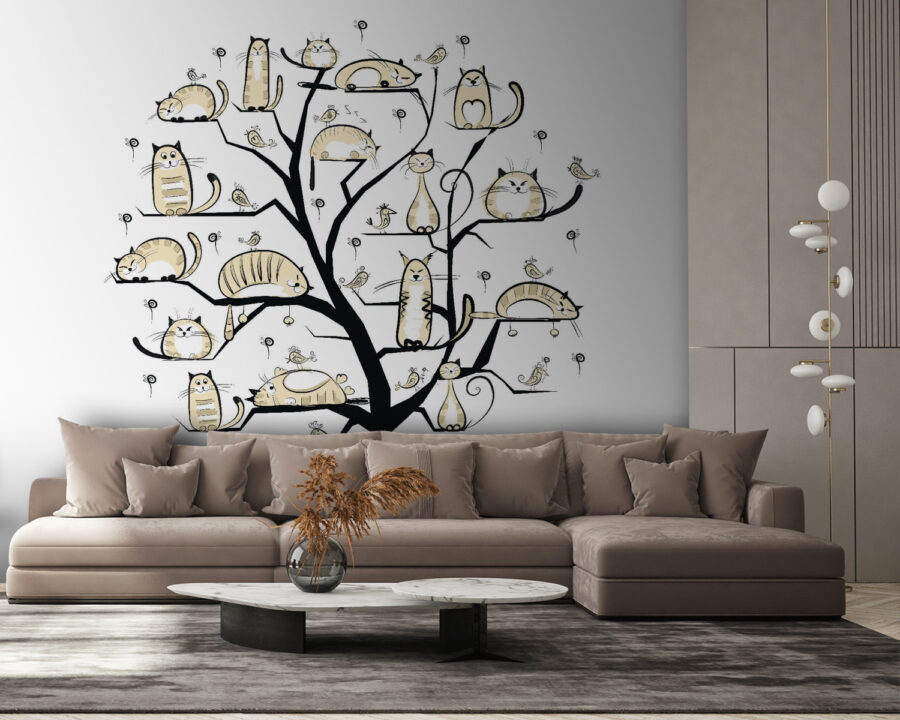 Φανταστείτε ένα φανταστικό δέντρο, με κλαδιά διακοσμημένα παιχνιδιάρικα με γάτες όλων των σχημάτων και μεγεθών — μερικές κοιμούνται, άλλες σχεδιάζουν επικές περιπέτειες. Αυτή η τοιχογραφία δεν είναι απλώς τέχνη στον τοίχο, είναι ένα ιδιόμορφο θέμα συζήτησης. Φανταστείτε την σε μια ζεστή γωνιά, όπου μαζεύονται φίλοι και το γέλιο γεμίζει τον αέρα. Οι απαλοί, ουδέτεροι τόνοι δημιουργούν μια ήρεμη ατμόσφαιρα, ιδανική για εκείνες τις τεμπέλικες Κυριακές που απλά θέλετε να πιείτε τον καφέ σας και να απολαύσετε τη γοητεία του χώρου σας. Είναι σαν να έχετε μια γάτα οικογένεια στον τοίχο σας, πάντα έτοιμη να σας διασκεδάσει — ή να κοιμηθεί. Αγαπάτε τις γάτες; Θα ενθουσιαστείτε.
