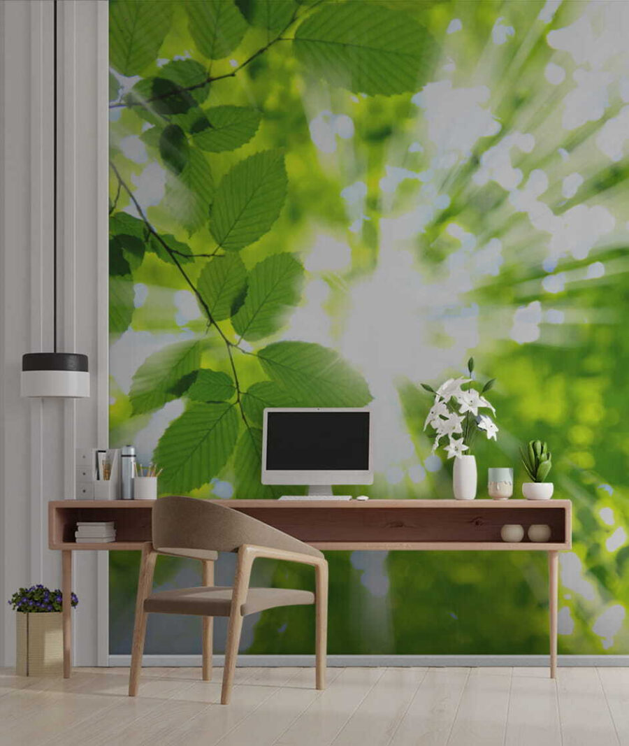 Φανταστείτε να ξυπνάτε σε ένα δάσος λουσμένο στις ακτίνες του ήλιου – αυτό είναι το είδος της ατμόσφαιρας που φέρνει στον χώρο σας αυτή η τοιχογραφία “Sunlight streaming through green leaves”. Είναι σαν η φύση να πάτησε παύση στην πιο τέλεια στιγμή και να είπε: “Ορίστε, πάρε αυτό”. Ιδανική για όποιον χρειάζεται λίγο περισσότερο πράσινο στη ζωή του (που, ας το παραδεχτούμε, είναι όλοι).