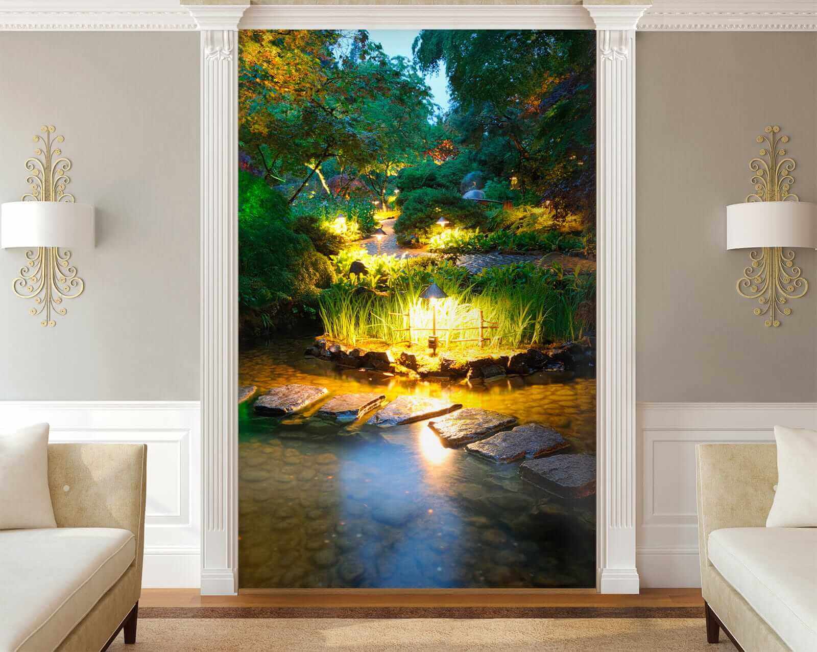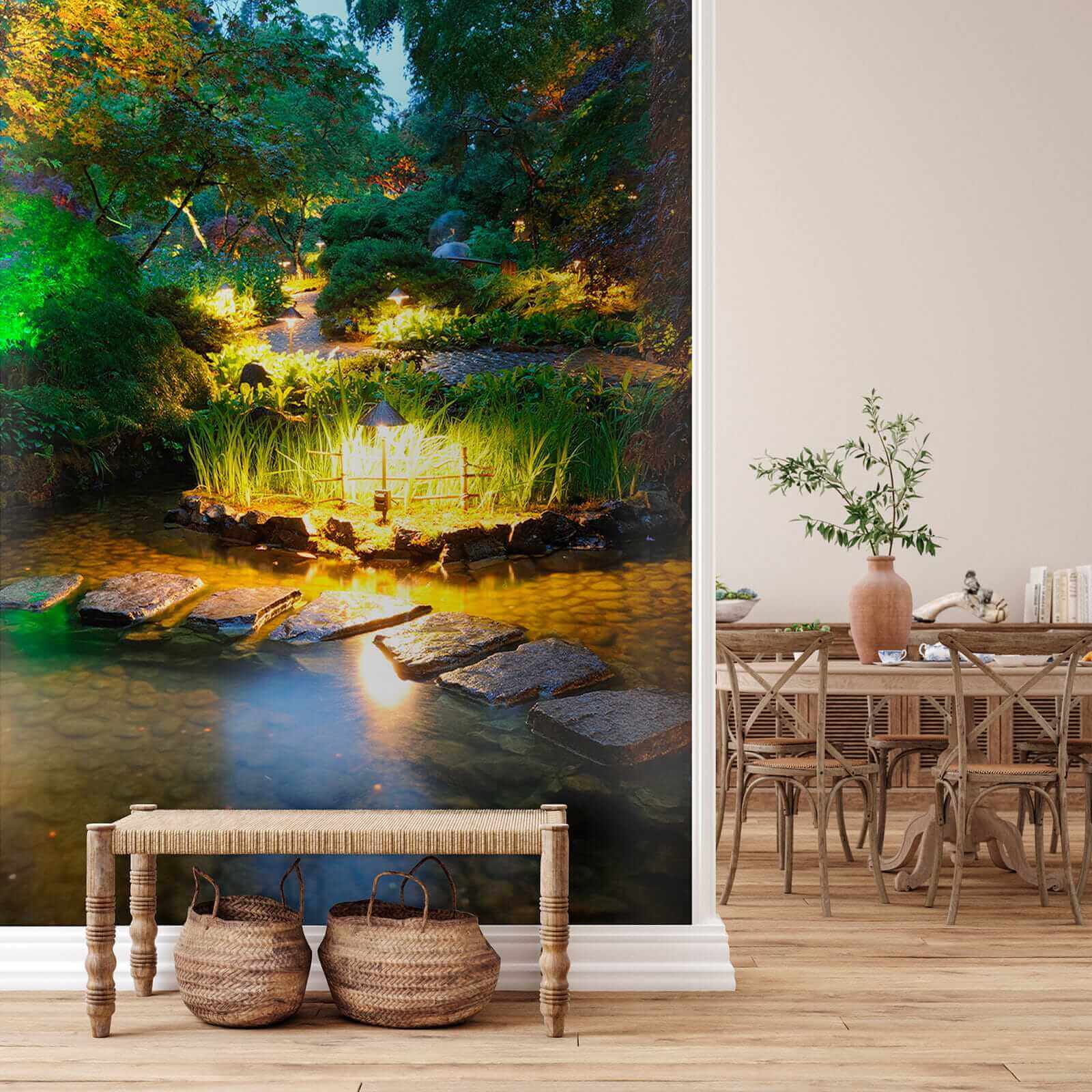 Μεταμορφώστε οποιονδήποτε χώρο με την μαγευτική «Τοιχογραφία Stone Path in a Pond with Lights». Φανταστείτε να μπαίνετε σε ένα ήσυχο καταφύγιο κατευθείαν από το σαλόνι σας! Αυτή η τοιχογραφία σας τυλίγει με χαλαρωτικές αποχρώσεις και απαλά λαμπερά φώτα, κάνοντάς σας να νιώθετε σαν να περιπλανιέστε σε έναν κρυφό κήπο το σούρουπο.