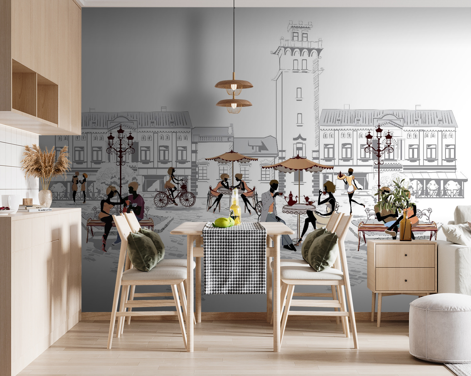 Φανταστείτε αυτό: μια γοητευτική σκηνή του δρόμου που φέρνει ένα μικρό κομμάτι ζωής στο σπίτι σας. Αυτή η τοιχογραφία αποτυπώνει μια ηλιόλουστη μέρα, όπου ένας άνδρας και μια γυναίκα κάθονται σε ένα άνετο παγκάκι, περιτριγυρισμένοι από τη βουή ενός πολυσύχναστου καφέ. Φανταστείτε το χτύπημα των φλιτζανιών του καφέ, τα γέλια των φίλων και ένα απαλό αεράκι που περνάει. Είναι ιδανικό για όποιον αγαπάει την ατμόσφαιρα της πόλης ή θέλει απλώς να αποδράσει σε μια γραφική στιγμή. Αυτό το κομμάτι όχι μόνο ζεσταίνει ένα δωμάτιο αλλά και προσκαλεί τους ανθρώπους να μοιραστούν ιστορίες και αναμνήσεις, πυροδοτώντας συζητήσεις όπως αυτές που συμβαίνουν στην τοιχογραφία. Ένας σίγουρος εκκινητής συζητήσεων!