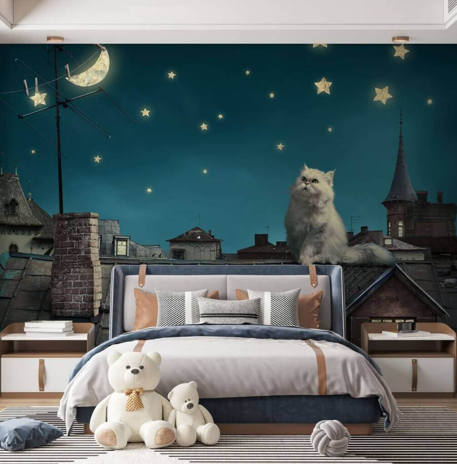 Εδώ είναι μια τοιχογραφία που θα σας κάνει να ονειρεύεστε νύχτες σε ταράτσες και έναστρο ουρανό. Το “Cat gazes at the night sky” είναι σαν να βγήκε από ένα ευφάνταστο παραμύθι. Φανταστείτε αυτή τη σκηνή στο σαλόνι σας ή στο δωμάτιο ενός παιδιού – τόσο μαγική! Το ονειρικό βλέμμα της γάτας στα αστέρια είναι απλά καθαρή μαγεία, μια ειρηνική απόδραση από τη φασαρία. Τα παιδιά θα λατρέψουν την παιχνιδιάρικη ατμόσφαιρα- οι ενήλικες θα λατρέψουν την ηρεμιστική αισθητική. Πρόκειται για ένα μείγμα αφηρημένης γοητείας και παιδικού θαύματος, ιδανικό για να πυροδοτήσει τη φαντασία. Επιπλέον, ποιος θα μπορούσε να αντισταθεί σε αυτό το αξιολάτρευτο, χνουδωτό αιλουροειδές που ατενίζει με περιέργεια τη νύχτα;