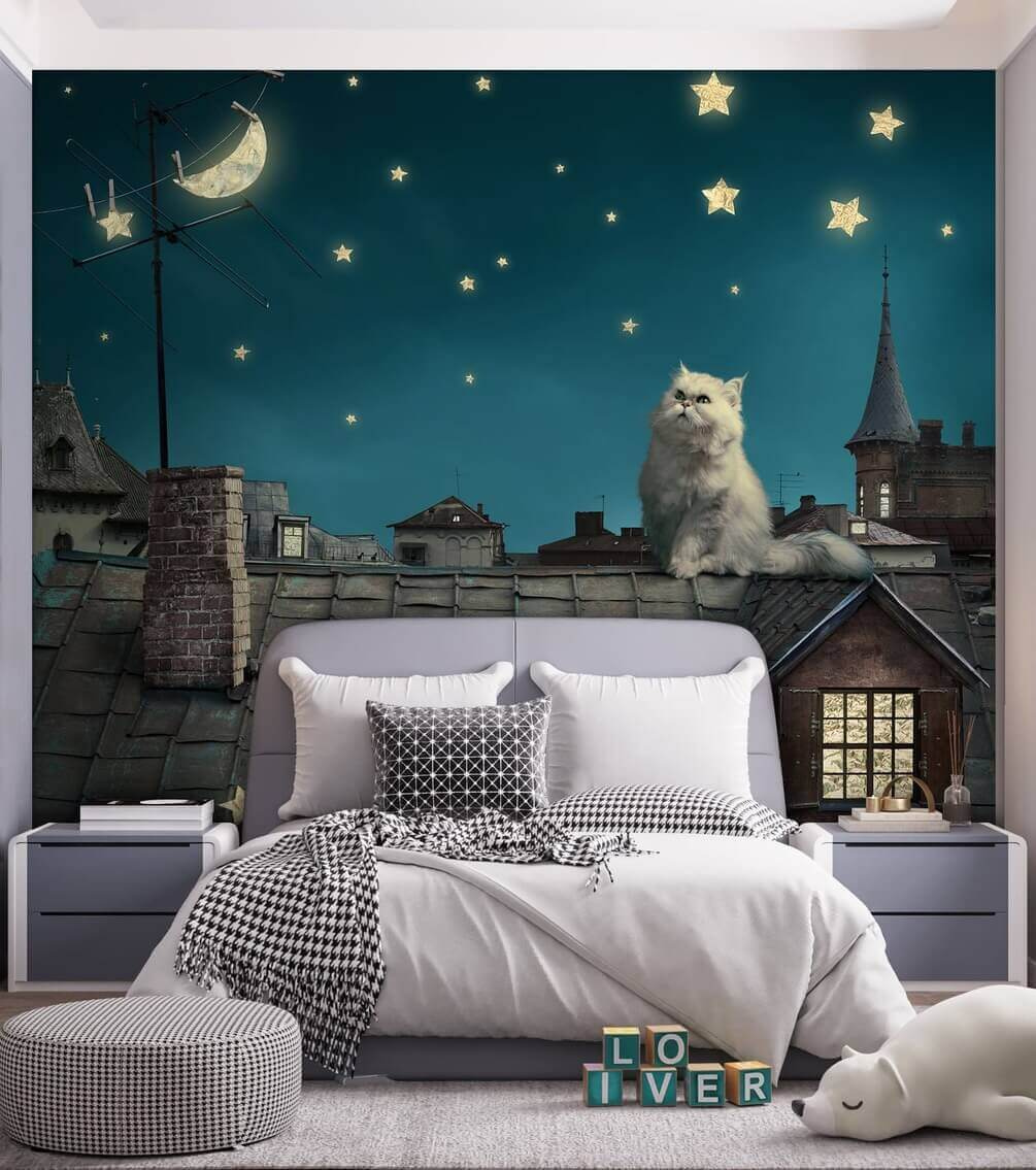 Εδώ είναι μια τοιχογραφία που θα σας κάνει να ονειρεύεστε νύχτες σε ταράτσες και έναστρο ουρανό. Το “Cat gazes at the night sky” είναι σαν να βγήκε από ένα ευφάνταστο παραμύθι. Φανταστείτε αυτή τη σκηνή στο σαλόνι σας ή στο δωμάτιο ενός παιδιού – τόσο μαγική! Το ονειρικό βλέμμα της γάτας στα αστέρια είναι απλά καθαρή μαγεία, μια ειρηνική απόδραση από τη φασαρία. Τα παιδιά θα λατρέψουν την παιχνιδιάρικη ατμόσφαιρα- οι ενήλικες θα λατρέψουν την ηρεμιστική αισθητική. Πρόκειται για ένα μείγμα αφηρημένης γοητείας και παιδικού θαύματος, ιδανικό για να πυροδοτήσει τη φαντασία. Επιπλέον, ποιος θα μπορούσε να αντισταθεί σε αυτό το αξιολάτρευτο, χνουδωτό αιλουροειδές που ατενίζει με περιέργεια τη νύχτα;