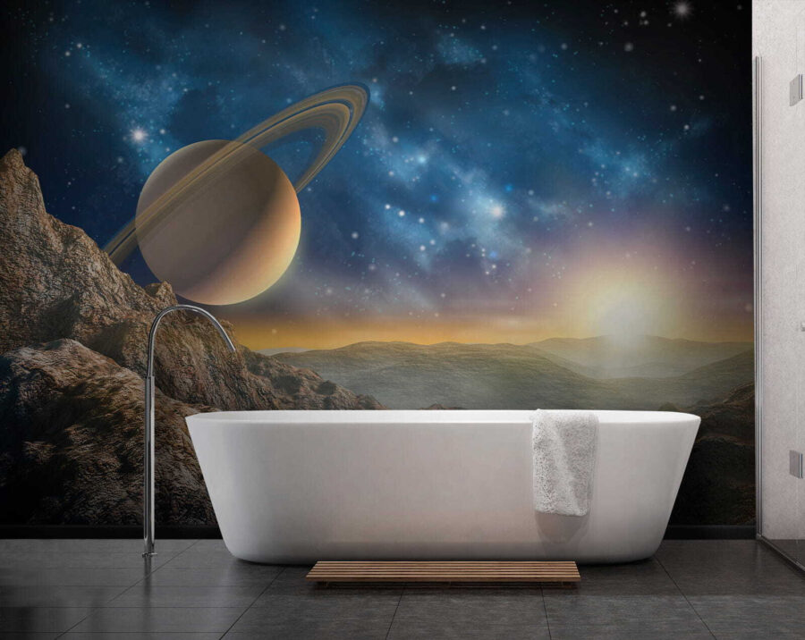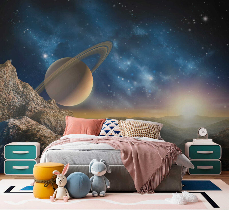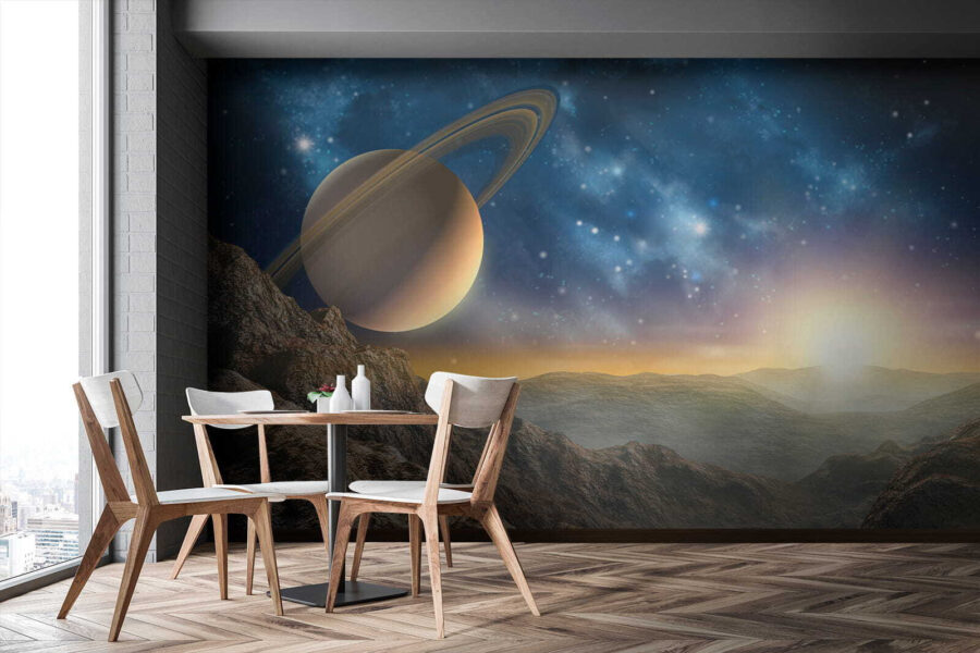 Μεταμορφώστε έναν απλό τοίχο σε ένα ουράνιο καταφύγιο με την «Τοιχογραφία Πλανήτης με Δαχτυλίδια στον Ουρανό». Αυτή η εκπληκτική τοιχογραφία σας μεταφέρει σε ένα ονειρικό τοπίο, όπου μεγαλοπρεπείς βουνά συναντούν έναν εντυπωσιακό πλανήτη στολισμένο με υπέροχα δαχτυλίδια. Φανταστείτε να χαλαρώνετε στο σαλόνι σας, όπου ο πρωινός ήλιος λάμπει, ρίχνοντας μια ζεστή λάμψη πάνω από αυτή την κοσμική σκηνή. Είναι σαν να έχετε ένα κομμάτι του σύμπαντος στο σπίτι σας! Οι φίλοι σας θα έρχονται και θα μένουν με το στόμα ανοιχτό, ενώ εσείς θα πίνετε χαλαρά το τσάι σας, νιώθοντας σαν ένας διαγαλαξιακός εξερευνητής. Ιδανικό για όσους αγαπούν να κοιτάζουν τα αστέρια ή απλά θέλουν να δώσουν μια κοσμική πινελιά στον χώρο τους — τώρα, αυτό είναι ένα θέμα για συζήτηση!