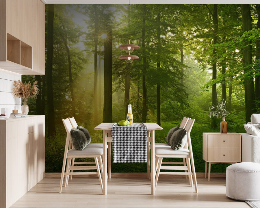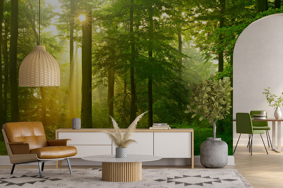 Μεταμορφώστε το χώρο σας με αυτή τη μαγευτική τοιχογραφία που προσκαλεί τη γαλήνη ενός ηλιόλουστου δάσους στο σπίτι σας. Φανταστείτε απαλές ακτίνες να φιλτράρονται μέσα από καταπράσινα φύλλα, δημιουργώντας μια ζεστή, φιλόξενη ατμόσφαιρα που σας κάνει να νιώθετε σαν να έχετε μπει στη φύση. Αυτό το κομμάτι δεν προσθέτει απλώς χρώμα, αλλά δίνει ζωή στο δωμάτιο, προκαλώντας ονειροπολήσεις για περιπλανήσεις στο δάσος.