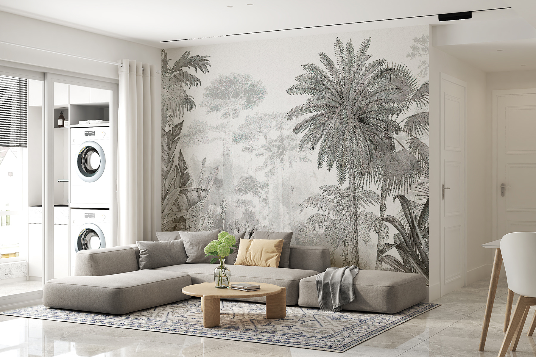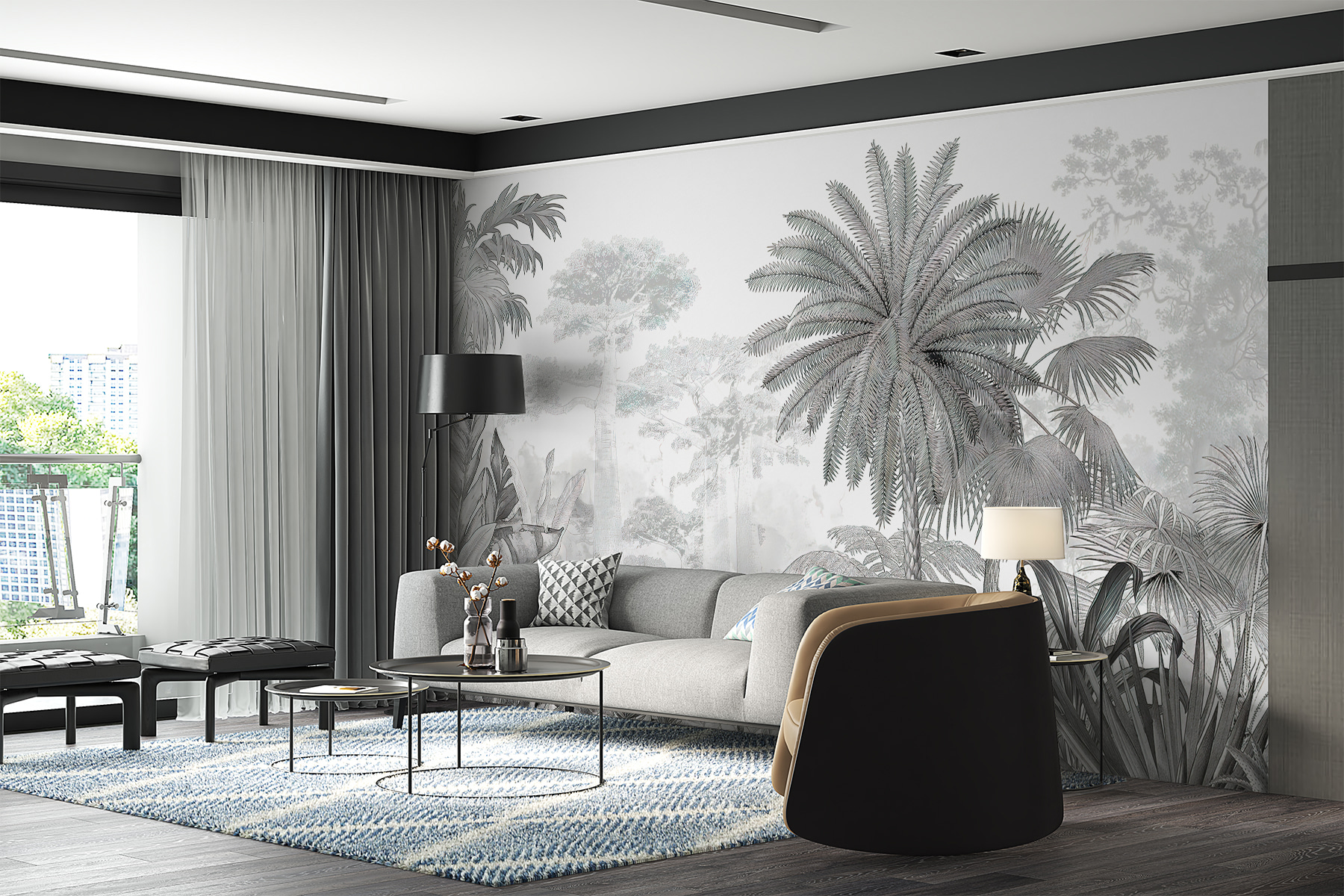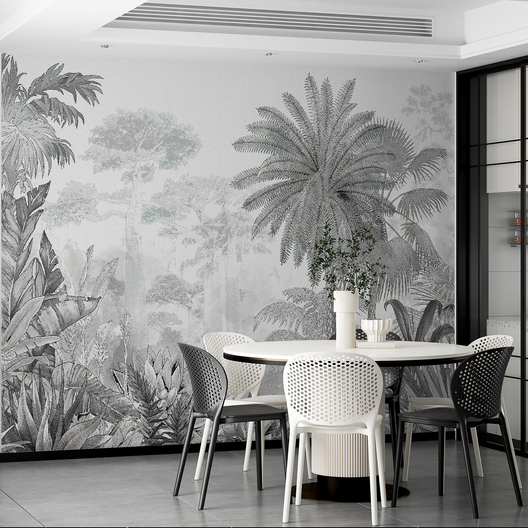 Αυτή η τοιχογραφία διαθέτει ένα μαγευτικό μείγμα από φοίνικες και φύλλα ζούγκλας, δημιουργώντας βάθος και αυτή την καθηλωτική αίσθηση που όλοι μας λαχταράμε κρυφά. Φανταστείτε να μπαίνετε στο σαλόνι σας και να αισθάνεστε σαν να έχετε μόλις βγει από τη φασαρία και να έχετε μπει σε έναν ονειρεμένο τροπικό παράδεισο. Είναι ιδανικό για έναν τοίχο δήλωσης, και οι μονοχρωματικές αποχρώσεις το καθιστούν εκλεπτυσμένο, όχι υπερβολικό.