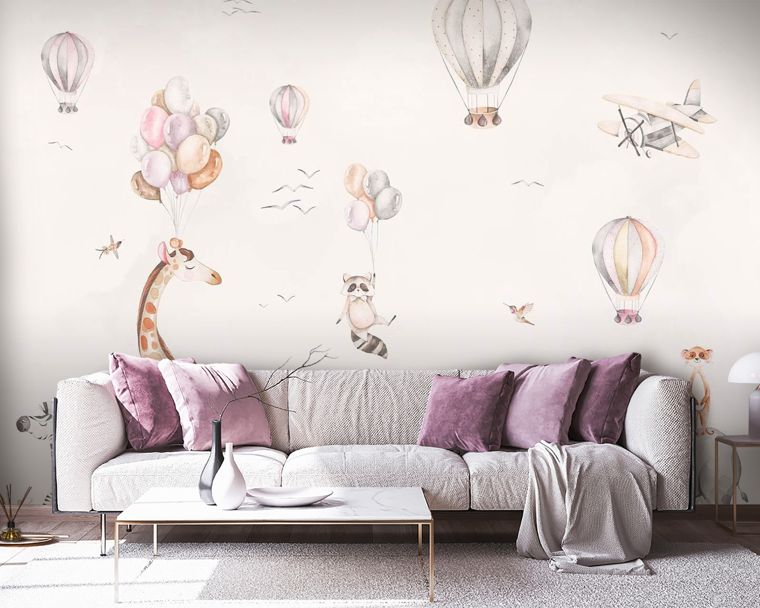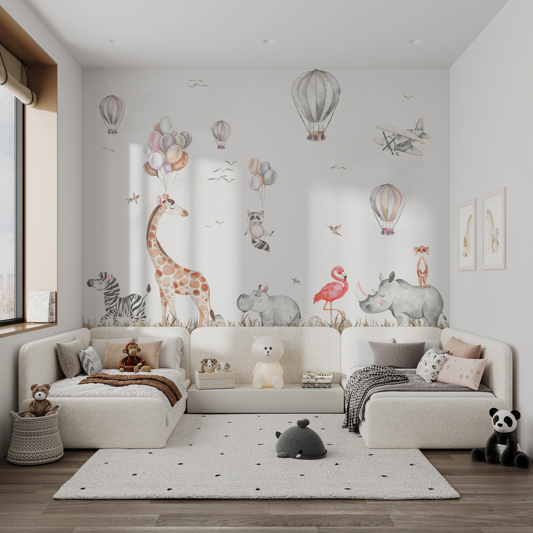 Φανταστείτε να μπαίνετε σε ένα δωμάτιο όπου ένας φανταστικός κόσμος ζωντανεύει. Αυτή η τοιχογραφία τοίχου, με έναν χαρούμενο ιπποπόταμο ανάμεσα σε φίλους όπως μια παιχνιδιάρα καμηλοπάρδαλη και ένα φλερτ φλαμίνγκο, φέρνει αμέσως χαρά. Φανταστείτε τα μικρά παιδιά να κοιτάζουν ψηλά, με μάτια γεμάτα θαυμασμό, καθώς τα μπαλόνια αιωρούνται από πάνω – σίγουρα το είδος της σκηνής που προκαλεί χαχανητά και ονειροπολήσεις. Ίσως και εσείς βρεθείτε να ρίχνετε μια ματιά, μεταφερόμενοι σε ένα ξέγνοιαστο απόγευμα όπου τα ζώα πετάνε ψηλά. Είναι ιδανικό για παιδικό δωμάτιο ή παιδότοπο, αλλά ειλικρινά, ποιος δεν θα ήθελε αυτή την απολαυστική ατμόσφαιρα οπουδήποτε; Ποιος ξέρει; Θα μπορούσε να εμπνεύσει την άγρια φαντασία ενός παιδιού ή απλώς να υπενθυμίσει σε έναν ενήλικα να πάρει τη ζωή λίγο λιγότερο σοβαρά. Μια βουτιά διασκέδασης που θα φωτίσει κάθε χώρο!