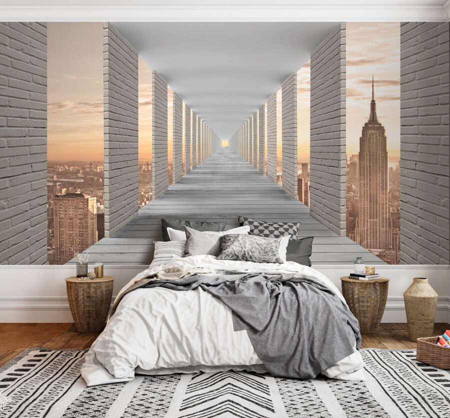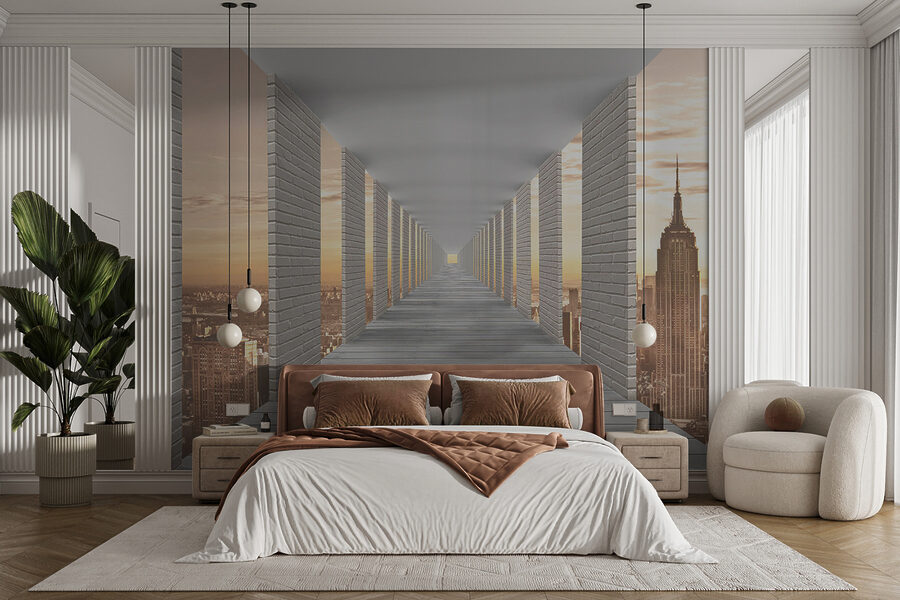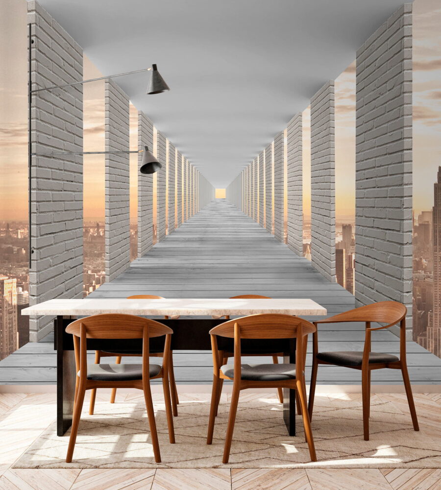 Φανταστείτε να έχετε αυτή την ονειρική τοιχογραφία στον τοίχο σας, όπου ένας ατελείωτος διάδρομος οδηγεί σε ένα μαγικό αστικό τοπίο. Οι δροσερές, αιχμηρές γραμμές του ψηλού κτιρίου και αυτά τα ατελείωτα παράθυρα δίνουν στο χώρο σας μια αίσθηση βάθους – σχεδόν σαν το δωμάτιό σας να μεγάλωσε και να έφτασε σε ένα εντελώς νέο επίπεδο εκλέπτυνσης. Οι ζεστές αποχρώσεις του ηλιοβασιλέματος έξω από τα “παράθυρα” προσδίδουν μια ζεστή αλλά και επεκτατική ατμόσφαιρα, ιδανική για να ονειροπολήσετε ή να προσποιηθείτε ότι βρίσκεστε σε ένα αριστοκρατικό αστικό loft. Είναι σαν οι τοίχοι σας να ανακάλυψαν ότι μπορούν να αποδράσουν χωρίς να σας αφήσουν πίσω! Μεταμορφώνει εντελώς έναν άχαρο τοίχο σε ένα στοιχείο που προκαλεί συζητήσεις. Η ατμόσφαιρα αυτής της τοιχογραφίας είναι τόσο… κομψή, καταλαβαίνεις; Και ποιος δεν θα ήθελε μια πρέζα από αυτό στο σαλόνι ή το γραφείο του;