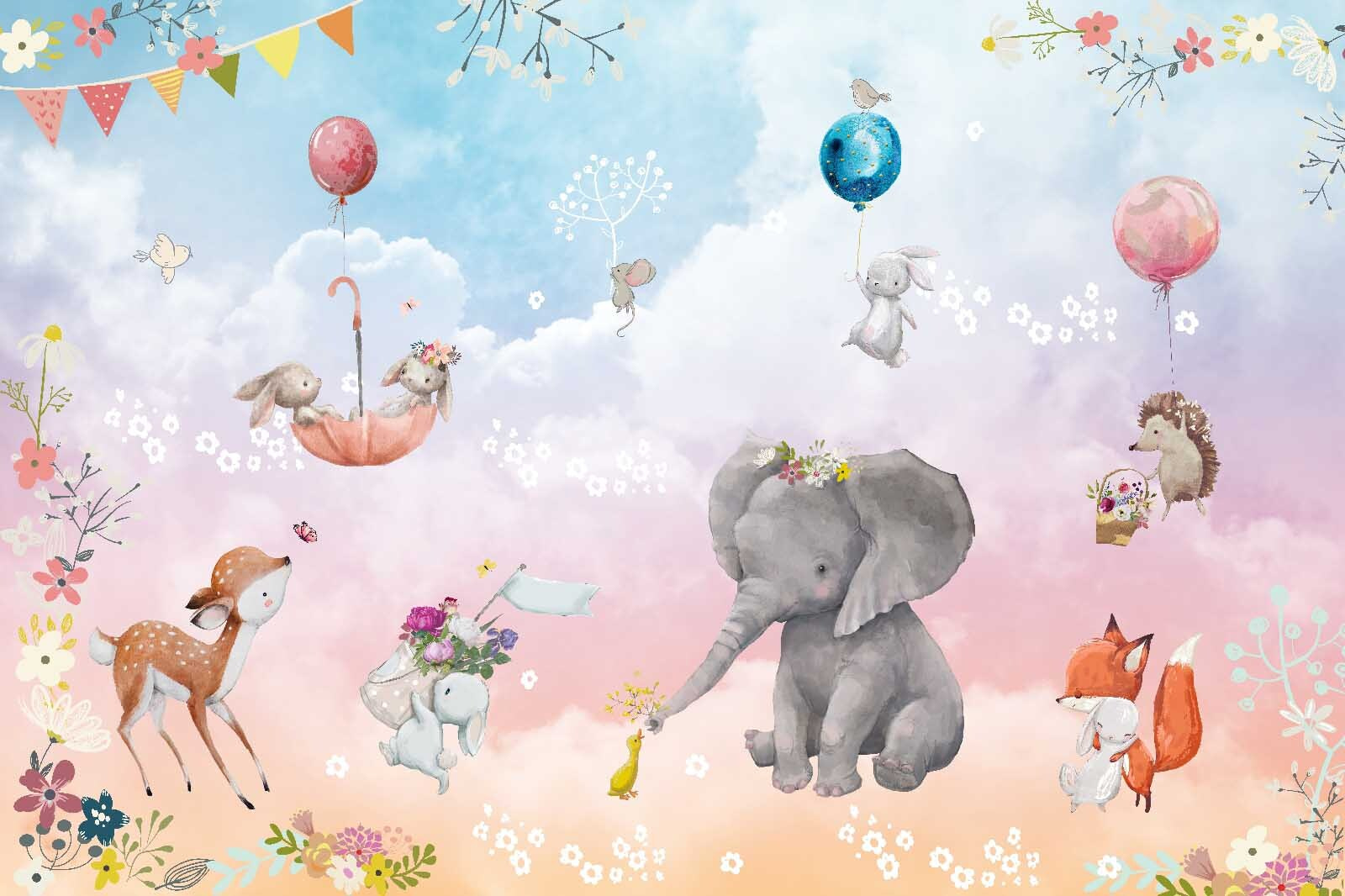 Μεταμορφώστε τον χώρο σας με αυτή την υπέροχη ταπετσαρία τοίχου με φανταστικά ζώα και χαρούμενα μπαλόνια. Φανταστείτε έναν ευγενικό ελέφαντα, στολισμένο με λουλούδια, να μοιράζεται μια στιγμή με παιχνιδιάρικα κουνελάκια και έναν περίεργο σκαντζόχοιρο, όλα κάτω από έναν ονειρικό παστέλ ουρανό. Είναι σαν μια σκηνή από ένα μαγευτικό παραμύθι!