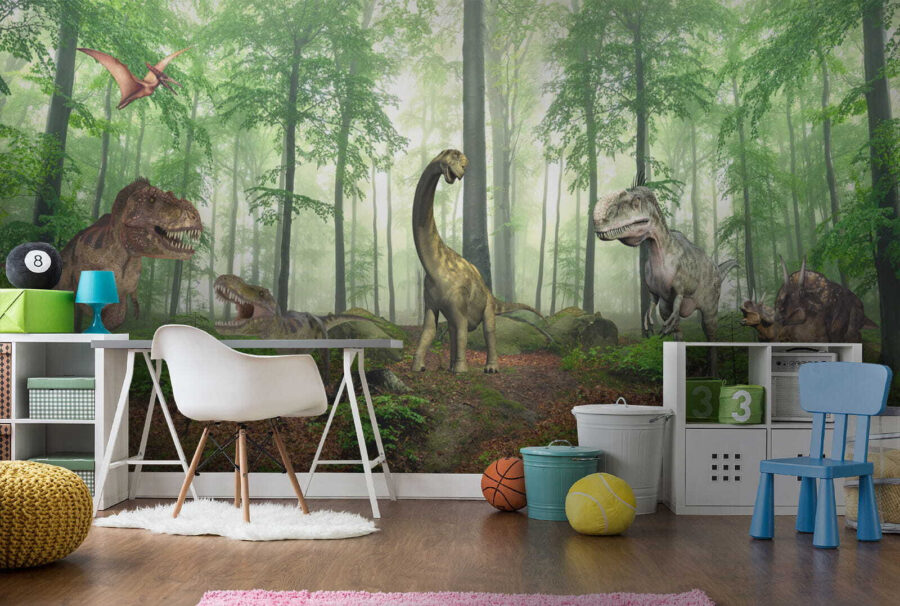 Μπείτε στον προϊστορικό κόσμο με αυτή την εκθαμβωτική τοιχογραφία “Δεινόσαυρος στο δάσος”. Φανταστείτε να μετατρέψετε οποιοδήποτε δωμάτιο σε ένα ζωντανό Ιουρασικό δάσος – τα παιδιά θα νιώθουν σαν μικροσκοπικοί εξερευνητές, που θα περιπλανώνται ανάμεσα σε πανύψηλα δέντρα και φιλικούς δεινοσαύρους. Είναι ιδανικό για να εξάψει τη φαντασία τους, και ποιος ξέρει, μπορεί να βρεθείτε και εσείς να αποφεύγετε τον T-Rex κατά τη διάρκεια του παιχνιδιού! Το πλούσιο πράσινο και οι λεπτομερείς δεινόσαυροι το κάνουν να μοιάζει σχεδόν αληθινό, φέρνοντας λίγη περιπέτεια και θαυμασμό στην καθημερινότητα. Μια απολαυστική πινελιά για κάθε παιδικό δωμάτιο, ή ακόμα και μια διασκεδαστική ανατροπή για τους τολμηρούς λάτρεις της διακόσμησης. Εγγυημένη αποδοχή!