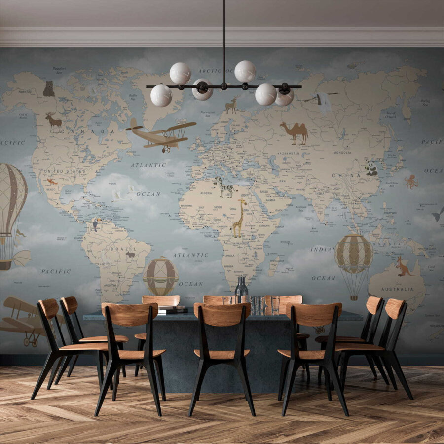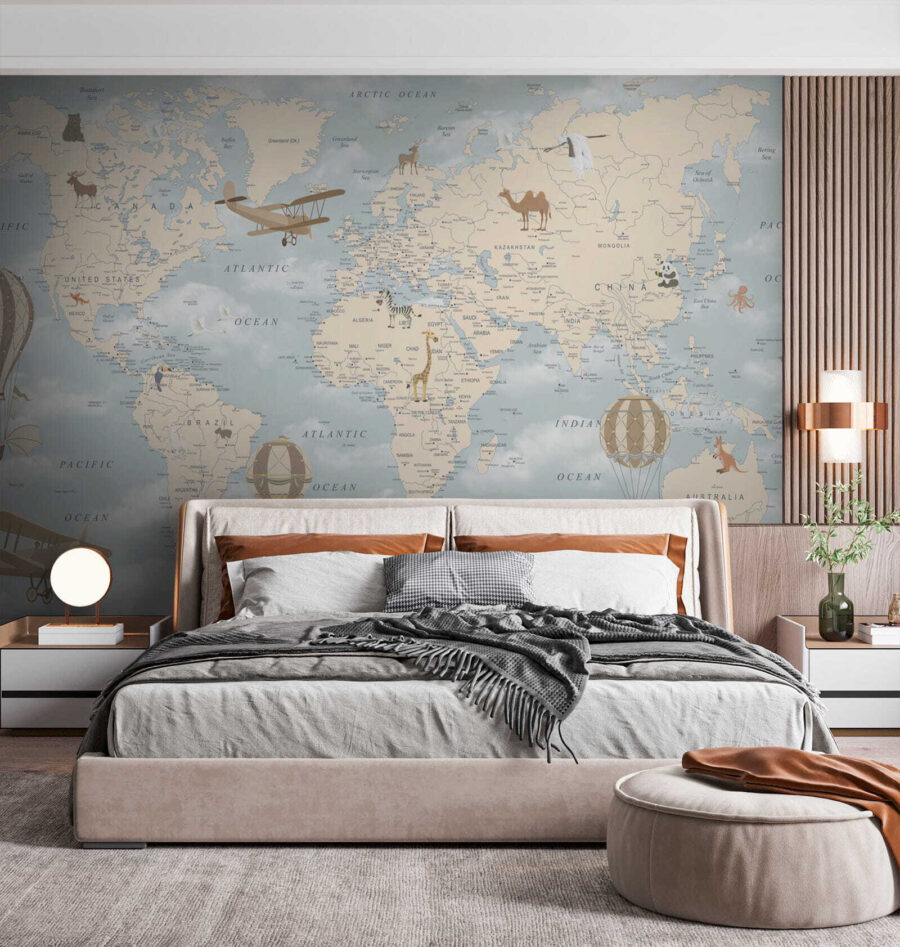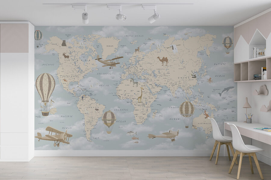 Φανταστείτε να μπαίνετε σε ένα παιδικό δωμάτιο και να σας υποδέχεται μια γοητευτική τοιχογραφία με αερόστατα που παρασύρονται γαλήνια πάνω από έναν παστέλ παγκόσμιο χάρτη. Είναι σαν να κάνετε ένα ταξίδι σε όλο τον κόσμο από την άνεση του σπιτιού σας. Ιδανική για να κεντρίσει την περιέργεια και τις ονειροπολήσεις, αυτή η τοιχογραφία είναι γεμάτη με ιδιόρρυθμες λεπτομέρειες – παιχνιδιάρικα ζώα, vintage αεροπλάνα και, φυσικά, αυτά τα ονειρεμένα αερόστατα που αιωρούνται ψηλά πάνω από τους ωκεανούς και τις ηπείρους σαν να βρίσκονται στη δική τους μικρή περιπέτεια.
